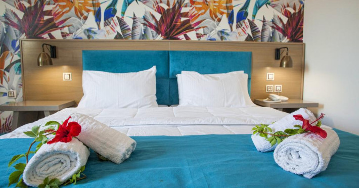 Sunt disponibile 76 camere. În camere există baie cu cadă sau duș ce are în dotare foehn și articole de toaletă gratuite. Camerele confortabile de la May Beach au pardoseală de gresie/ marmură, aer condiționat, Tv cu canale prin satelit și seif. Camerele au balcon cu masă și scaune unde pot fi petrecute momente de relaxare. Oaspeții au acces gratuit la serviciul Wi-fi în camere. Curățenia in cameră se face zilnic. Toate camerele spațioase de la May Beach au zonă de relaxare. Fiecare unitate de cazare are frigider. Proprietatea oferă camere pentru familie cu o suprafață mai mare și un număr mai mare de paturi față de cele standard.