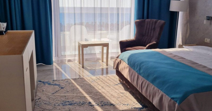Camera dubla superior poate acomoda 2 adulti, este situata la etajul al doilea, etaj nou, inaugurat in sezonul estival 2023. Are vedere frontala la mare, pat matrimonial (1.80 x 2.00 mp), baie, minibar, Ac si terasa.