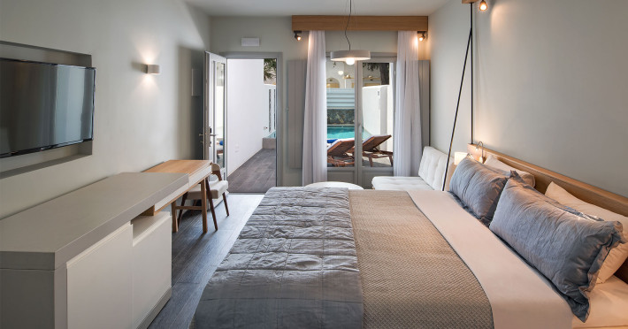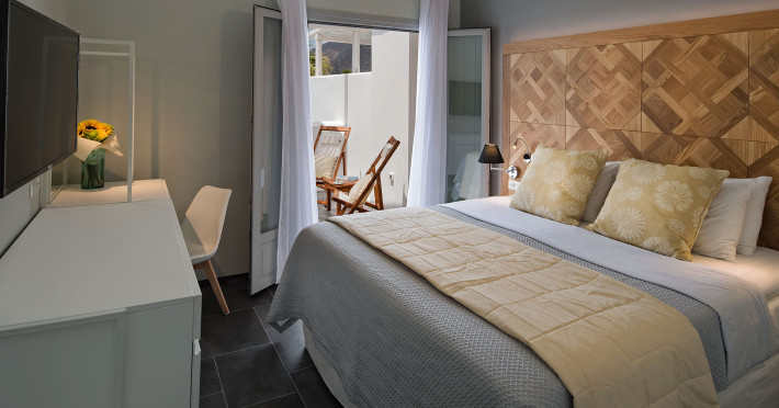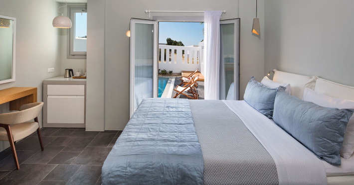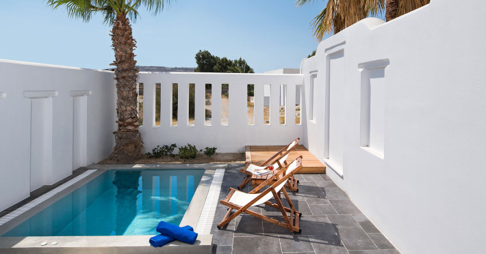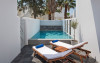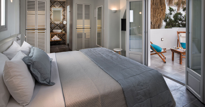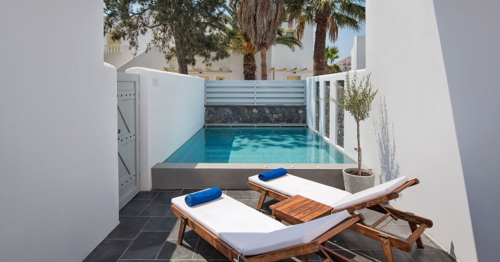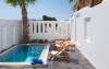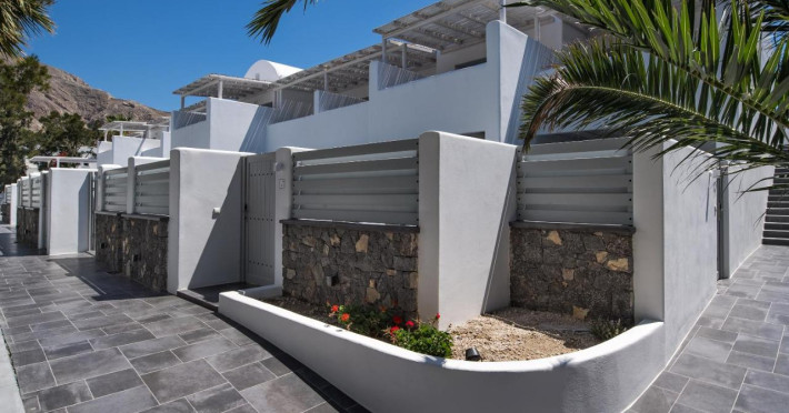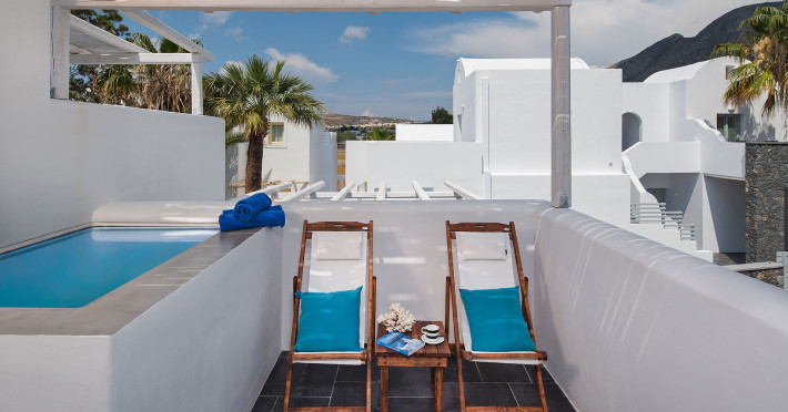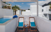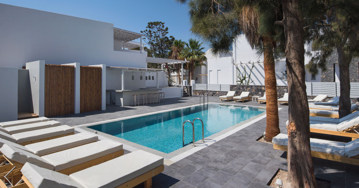 Meltemi Suites each one with distinguishing furniture and range of colours. The pool with the stone decoration and the arches is the ideal place to have your breakfast, as well as your evening drink under the light of the stars. The hotel is only 400 meters away from the beach, where "Atlantis Island" Restaurant serves delicious dishes. A very romantic place on the island of Santorini. Hotel without small children.