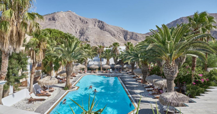 The highlight of the hotel is the big pool with the palm trees, that gives an exotic sensation and is one of the biggest among hotels in Perissa. Besides the pool, lies the pool-bar of the hotel where you can have a drink relaxing by the pool or try some of our delicious snacks served during lunch time.