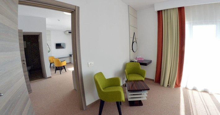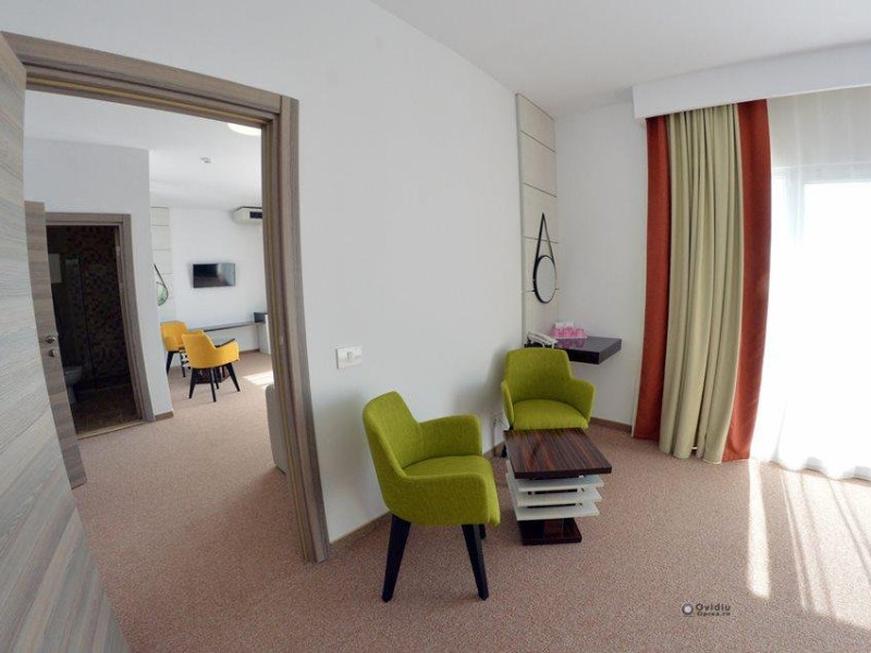 Apartamente junior: 4 - este compus dintr-o camera de zi, cu canapea extensibila si dormitor cu pat matrimonial, avand o suprafata de aproximativ 30 mp. Fiecare camera dispune de baie proprie si balcon. Recomandare: Junior Suite este destinat cazarii a 2 adulti si 2 copii sau 3 adulti.