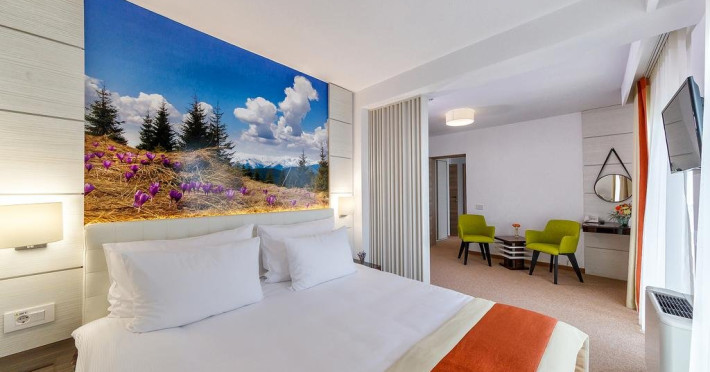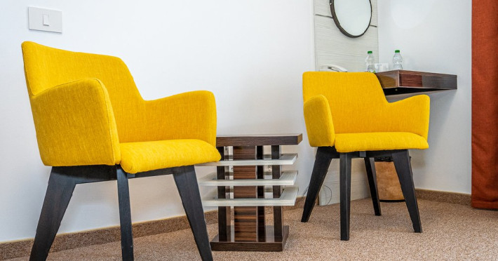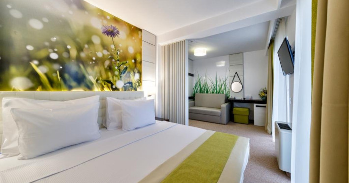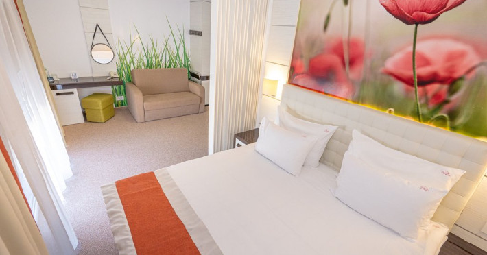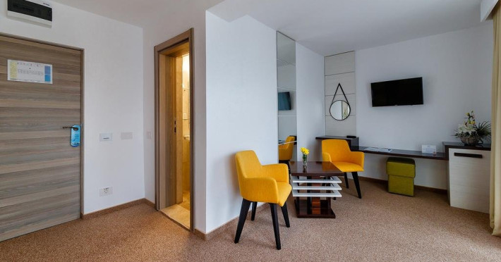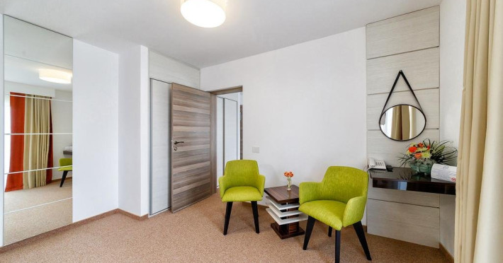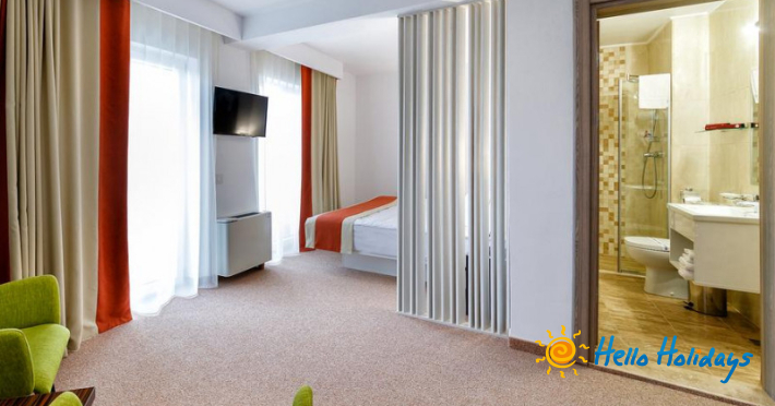 Apartamentul Junior Suite: acest apartament de 30 mp are o camera de zi cu canapea extensibila, un dormitor cu pat matrimonial, birou cu fotolii si doua bai cu cabina de dus. Aerul conditionat, TV LCD si internetul gratuit aduc un plus de confort in acest apartament cu design modern si vedere la mare. De asemenea, este dotat cu telefon, mini bar, seif, cosmetice si uscator de par, fiind Ideal pentru escapade estivale sau calatorii in scop de business pe litoralul Marii Negre. In hotel sunt 4 apartamente disponibile pentru o cazare in Mangalia, toate fiind dotate cu un balcon spatios de unde poate fi admirata marea.