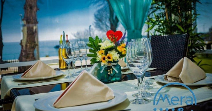 Restaurant Mera Brise: bun gust, la propriu si la figurat. Restaurantul cu terasa ofera varietate de arome si culori in farfurie: bufet cu arome internationale si meniu a la carte pentru o experienta completa, inca de la prima ora. Pofta de viata la pranz si cina, cu preparate proaspete, la un minut de plaja Mangalia. Ingrediente naturale si o atmosfera animata, la lasarea serii. Tematica zilnica: muzica live cu ritmuri armonioase si voie buna.