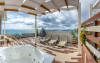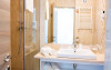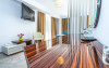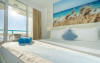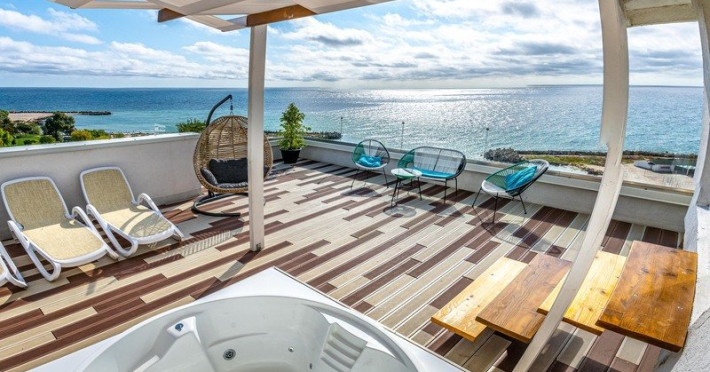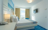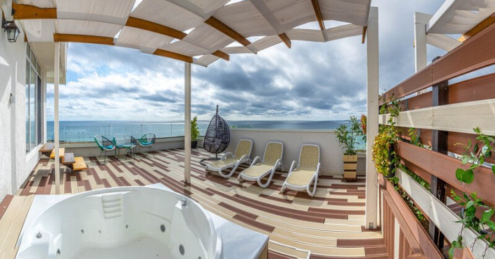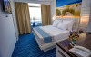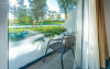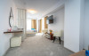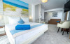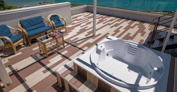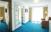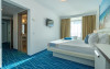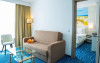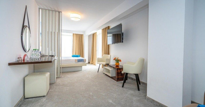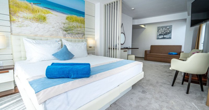 Apartamentul Junior Suite cu Jacuzzi cu o suprafata de aproximativ 30 mp, are o camera de zi cu canapea extensibila si un dormitor cu pat matrimonial (180/190cm), sistem de acces in camera pe baza de cartela/ratara, AC, TV, telefon, seif, o singura baie cu cabina de dus, uscator de par, cosmetice hoteliere, prosoape de plaja, terasa cu jacuzzi, minibar contra cost. Apartamentul dispune de o terasa generoasa cu jacuzzi. Acest tip de camera nu suporta adaugarea unui pat suplimentar si este destinat cazarii a 2 adulti si 2 copii sau 3 adulti.