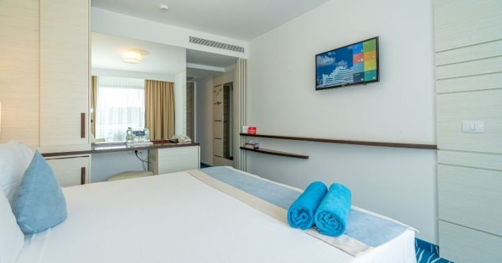 Camera dubla matrimoniala cu o suprafata de aproximativ 15 mp, pat matrimonial (180/190 cm), sistem de acces in camera pe baza de cartela/bratara, AC, TV , telefon, seif, baie cu cabina de dus, uscator de par, cosmetice hoteliere, prosoape de plaja, balcon, minibar contra cost. Intr-o camera dubla se poate adauga maxim un pat suplimentar(pat pliant) sau un patut pentru bebe. Camera dubla poate gazdui 2 adulti si 1 copil.