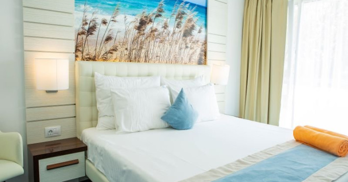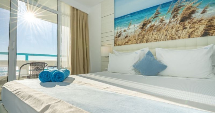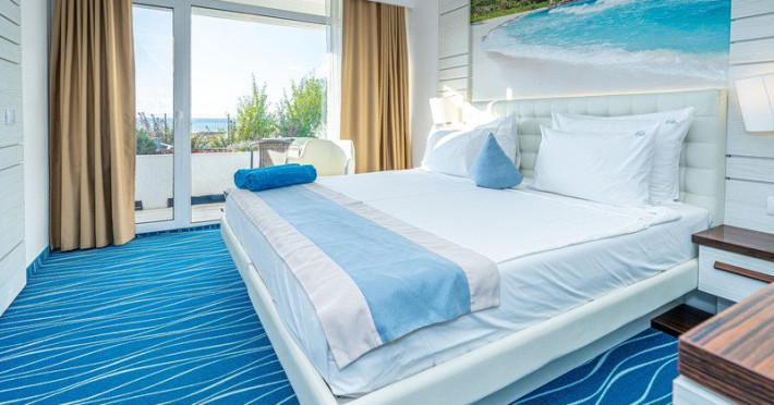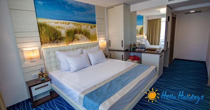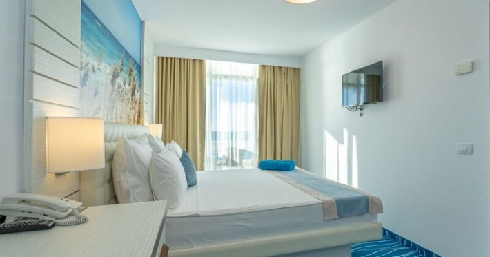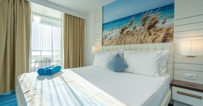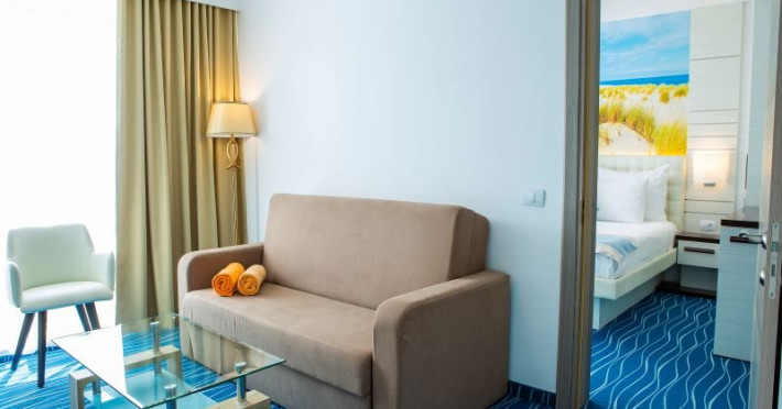 Apartamentul Junior Suite cu o suprafata de aproximativ 30 mp, are o camera de zi cu canapea extensibila si dormitor cu pat matrimonial, . Apartamentul dispune de o singura baie cu dus, sistem de acces in camera pe baza de cartela/bratara, AC, TV, telefon, seif, uscator de par, cosmetice hoteliere, prosoape de plaja, balcon cu vedere la statiune, minibar contra cost. . Acest tip de camera nu suporta adaugarea unui pat suplimentar. Acesta este destinat cazarii a 2 adulti si 2 copii sau 3 adulti.