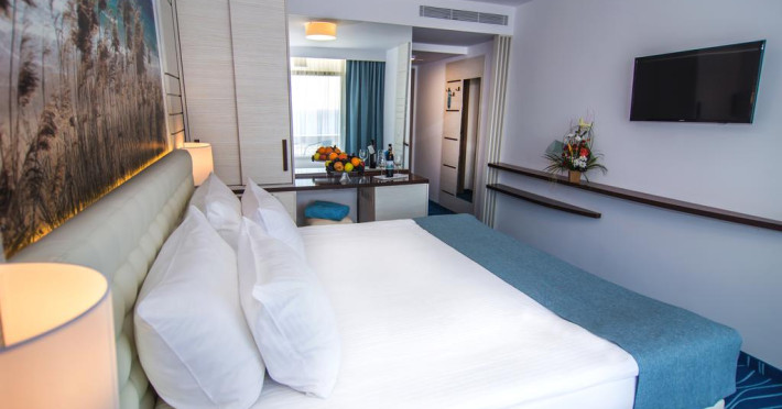 Situat in partea de sud a statiunii Jupiter, la 30 de metri de plaja. Facilitati hotel: receptie non-stop, restaurant, bar, terasa, aer conditionat, seif, lift, bancomat, loc de joaca pentru copii, plaja, piscina in aer liber, piscina pentru copii, jacuzzi, prosoape pentru plaja / piscina, sala de conferinta si petreceri (cost suplimentar), business centre (cost suplimentar), zona pentru fumatori, camere izolate fonic, camere de familie, camere pentru nefumatori, parcare gratuita, parcare pentru persoanele cu dizabilitati, internet wireless gratuit. Resortul asigura peste 700 de locuri în cele 350 de spatii de cazare. Facilitati camere: WI FI, telefon, minibar, seif, cabina de dus, uscator de par, cosmetice hoteliere, cartela de acces, aer conditionat, TV LCD, balcon, uscator de rufe, prosop piscină si plaja.Datorita dinamicitatii domeniului disponibilitatea ofertelor se modifica de la un moment la altul. De aceea ofertele sunt valabile in limita locurilor disponibile. Agentia nu este responsabila pentru eventualele neconcordante care pot aparea intre informatiile privind tarifele si alte detalii din site si informatiile primite in agentie. In aceste cazuri vor avea prioritate, intotdeauna, informatiile primite in agentie.