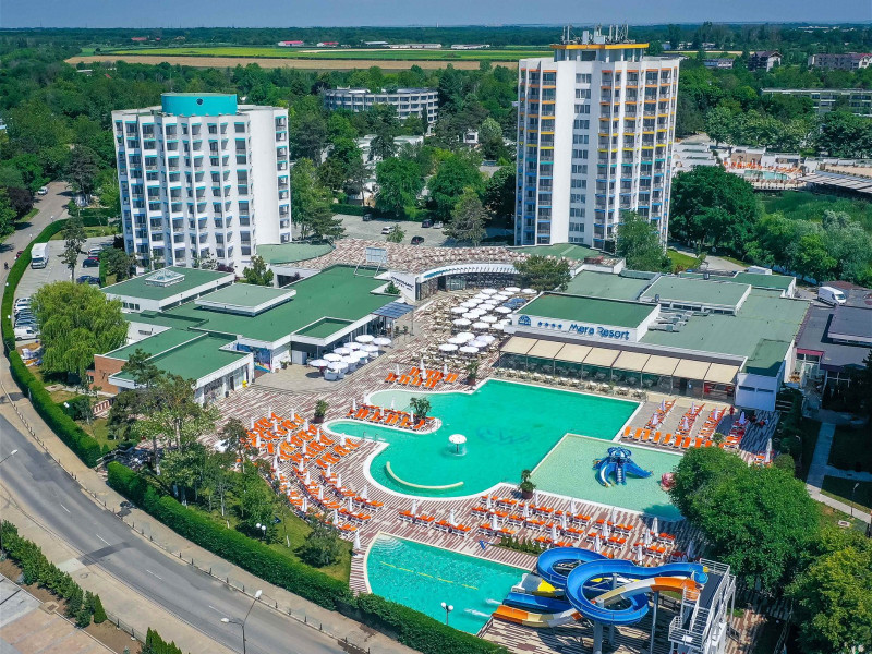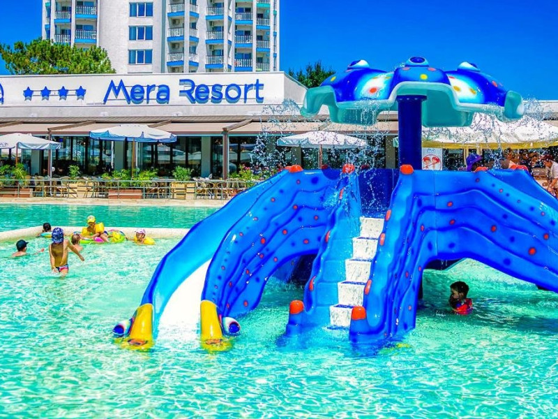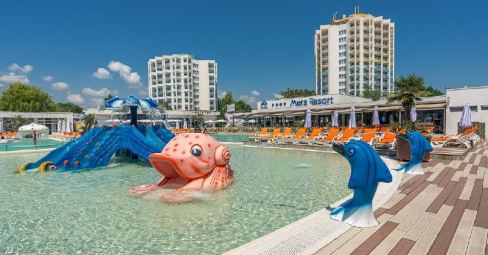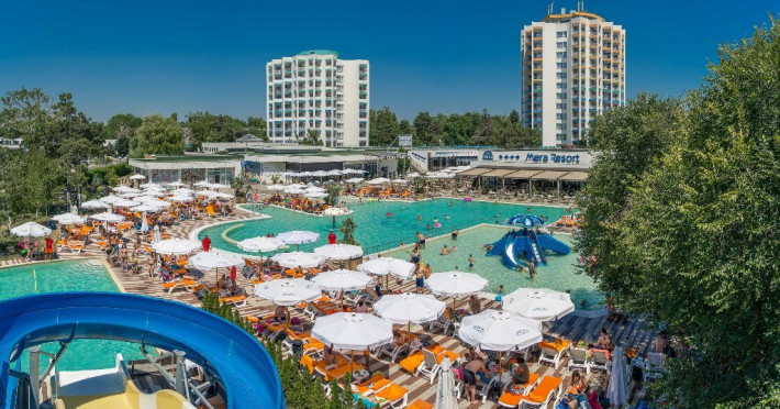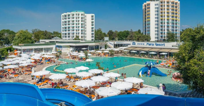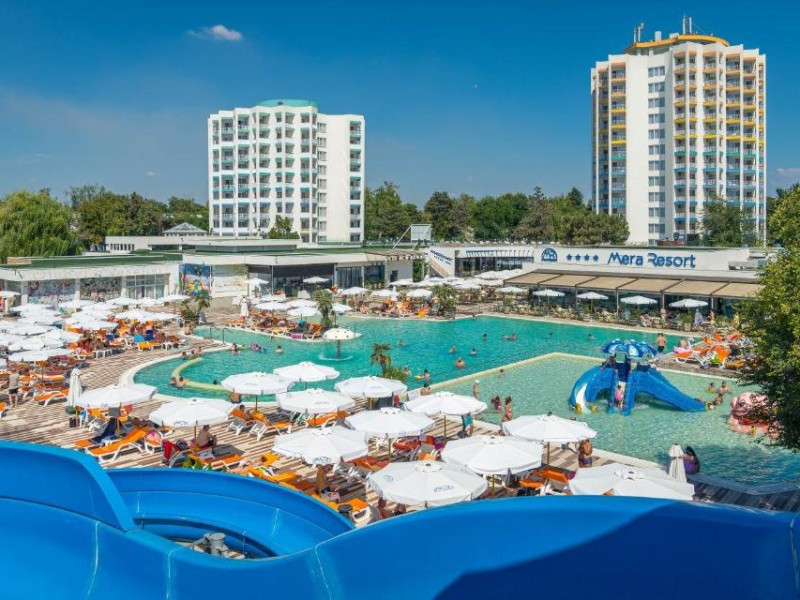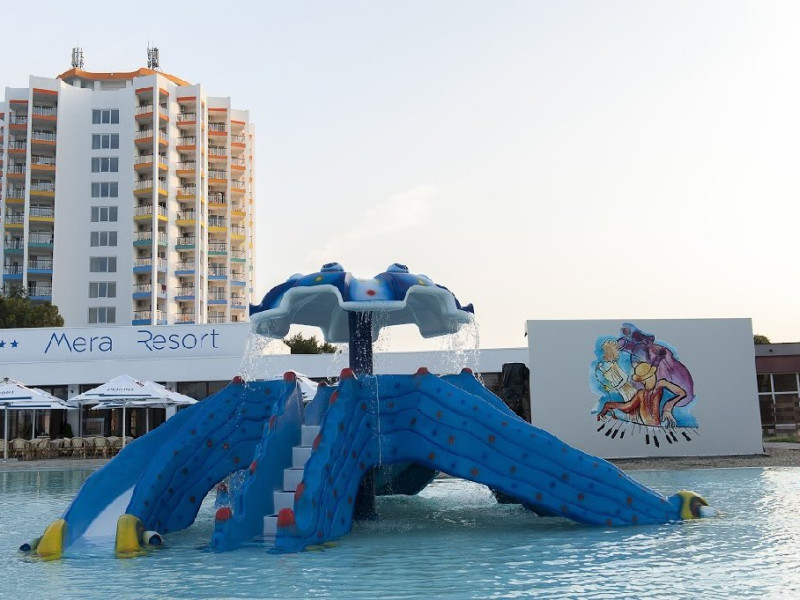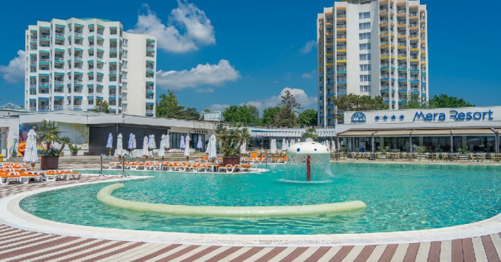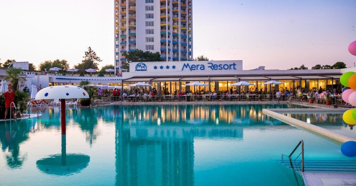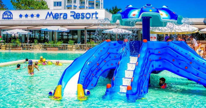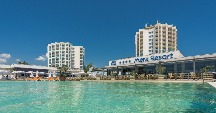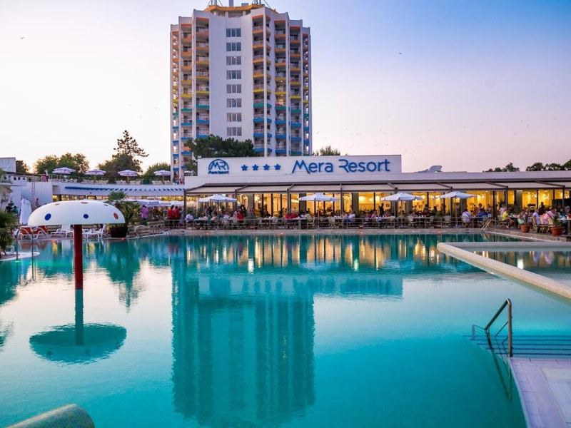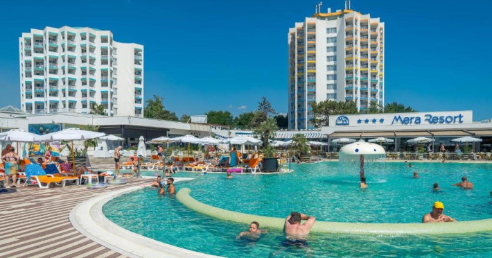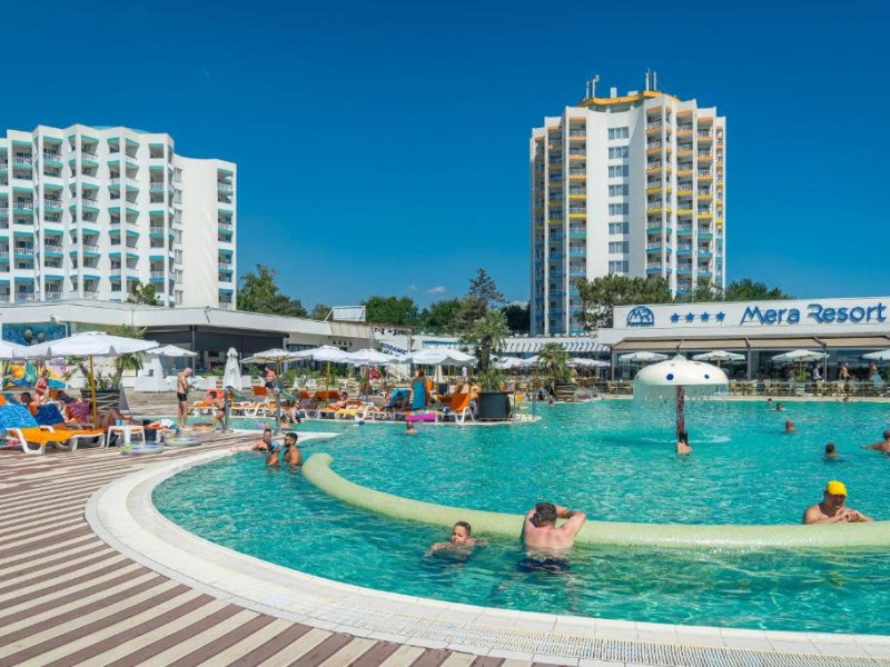 Hotelul Mera Resort dispune de plaja privata. HOTEL MERA RESORT VENUS este alcatuit din 2 corpuri de hotel - Mera Sky si Mera Blue - si un complex de 49 de vile cu accente mediteranene - Mera Villas. Cele 2 hoteluri sunt conectate printr-o receptie comuna, un spatiu larg, modern si rafinat, unde stilul si eleganta sunt in stransa legatura cu preocuparea permanenta a intregii echipe Mera pentru confortul si buna dispozitie a oaspetilor sai. Resortul este situat in centrul statiunii, la 100 m distanta de plaja Venus. Cazarea se efectueaza incepand cu ora 13:00, iar eliberarea camerelor se realizeaza pana cel tarziu la ora 11:00. Nu se accepta animale de companie. Fumatul este interzis in incinta Resortului, exceptand balcoanele camerelor si spatiile special amenajate. Va informam ca incepand cu sezonul 2021 se va incasa la check-in taxa de statiune, in valoare de 5 lei/ persoana/ zi, conform HCL 283/23.12.2020. Vor fi taxate toate persoanele cu varsta de 18 ani impliniti. Dotari si servicii Piscina principala exterioara - este una dintre cele mai frumoase din zona, avand o suprafata de 1000 mp si un design modern. Va puteti relaxa pe sezlongruile confortabile de pe marginea piscinei sau puteti profita de nenumaratele atractii acvatice: dusurile cervicale, banchetele cu hidromasaj si gheizerele, precum si Aqua vortex - acesta este special gandit pentru doritorii de senzatii tari, permite inotatorilor rezistenti sa mearga impotriva curentului sau pur si simplu sa se lase trasi de flux. Piscina pentru copii - are o adancime de 50 cm si este dotata cu un mini Aqua Park, detine o piscina cu tobogane acvatice cu 3 canale pentru cei mari. Piscina pentru copii este special amenajata astfel incat activitatile desfasurate sa beneficieze de cele mai inalte standarde de siguranta. La piscine se desfasoara pe tot parcursul zilei diverse programe: aqua gym, concursuri, spectacole si alte surprize. Piscinele secundare - ale resortului sunt situate in zona Mera Villas, o adevarata oaza de liniste, fiind optiunea ideala pentru a-ti petrece zilele insorite de vara intr-o atmosfera relaxanta. Rasfatul unei zile la piscina este o experienta in sine. Accesul este permis intre orele 08:00 - 20:00 Plaja Mera Resort - este situata la aproximativ 500 m avand nisip fin, apa curata si intrare lina in mare, dispunand de beach bar gratuit. Oaspetii Mera Resort au la dispozitie in mod gratuit sezlonguri, umbrele si masute la plaja, in limita locurilor disponibile. Restaurant - Cum experienta turistica nu poate fi niciodata completa fara a integra si latura ei culinara, restaurantele Mera Resort si Mera Villas va ofera in regim All Incluisve o gama diversificata de preparate, atat din bucataria traditional romaneasca, cat si din cea internationala. Maestrii laboratorului propriu de patiserie va vor delecta cu cele mai proaspete si gustoase produse. Pe terasa zonei centrale a complexului este amplasat barul a la carte unde va veti putea delecta, contra cost, cu o gama larga de bauturi si cocktail-uri. Parcare gratuita - cu aproximativ 450 de locuri de parcare. Locurile de parcare nu pot fi rezervare, acestea se aloca in limita disponibilitatii, resortul nu garanteaza locul de parcare.Accesul autoturismelor in parcarile Mera Hotels va fi posibil incepand cu ora 13:00. Centrul SPA Wellness Mera Resort - este zona in care iti poti rasfata toate simturile. Aici poti sa te relaxezi in saloanele de masaj si de infrumusetare, piscina interioara, in aburul de miresme imbietoare al saunei si al hammamului sau in sala de fitness dotata cu aparatura moderna. Mera Spa Wellness se intinde pe aproximativ 800 mp si este impartit in 3 zone: Wellness, Pool Thermarium si Fitness ( cu vedere la gradina Zen). Zona Wellnes cuprinde un cabinet de masaj single, un cabinet suite ( pentru terapii in cuplu), prevazut cu cada de hidromasaj dubla, cu cromoterapie si ozonoterapie, precum si dus tropical cu cascada. Cabinetul de infrumusetare este dotat cu pat electric cu masaj si infrarosii, aparat cu oxygen hiperbaric pentru terapii faciale si corporale. Zona Pool Thermarium are in componenta piscina incalzita (>28 grade) cu o suprafata de 80 mp si o adancime de 140 cm, cu cascade cervicale si inot impotriva curentului, dusuri emotionale, fantana de gheata, bazine Kneipp cu cascade cervicale ( apa are o temperatura de 17, respectiv 35 grade), sauna finlandeza ( uscata), baie de vapori ( sauna umeda), bio-sauna ( o alternativa moderna a Finish saunei), salina cu sare de Himallaya, hammam ( Ceremonial turcesc/ Ritual marocan). Toate serviciile oferite in Centru Spa Wellness sunt contra cost. Kids Club Kids Park - Mera Resort a pregatit pentru cei mai mici oaspeti ai sai o serie de experiente incantatoare, punandu-le la dispozitie alte doua spatii destinate exclusiv lor: loc de joaca in interior si un parc in aer liber, unde se pot bucura de o multime de jocuri si activitati. Printre activitatile ce se desfasoara pe parcursul intregii zile in aceste zone, amintim teatru pentru copii, parada si momente unice oferite de personajele Disney. Programul Artistic Mera - Terasa restaurantului este animata in fiecare seara de nenunmarate momente artistice, atat pentru copii, cat si pentru adulti. La Mera Resort aveti ocazia de a petree cele mai antrenante seri de vara, bucurandu-va de muzica live, dansatori salsa, ansambluri populare, cabaret, alaturi de multi ati invitati si momente-surpriza. Cu pasiune si dedicare, in fiecare an, Mera Resort da tonul bunei dispozitii estivale si va asteapta sa reveniti, de fiecare data cu aceeasi bucurie, pentru a compune impreuna cele mai frumoase povesti de vacanta. Programul de entertainment de pe Terasa Restaurantului Mera se va desfasura zilnic intre orele 19:00 - 22:30. Servicii masa: - masa se serveste in restaurantul propriu in sistem bufet suedez. In incinta restaurantului, accesul este permis doar cu o tinuta decenta, fara obiecte si accesorii de plaja. Programul de functionare al barului a la carte din zona piscin