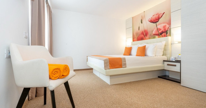 Apartamentul Junior Suite este compus dintr-o camera de zi, cu canapea extensibila (160cm/200cm) si dormitor cu pat matrimonial. Fiecare camera dispune de baie proprie si balcon.
