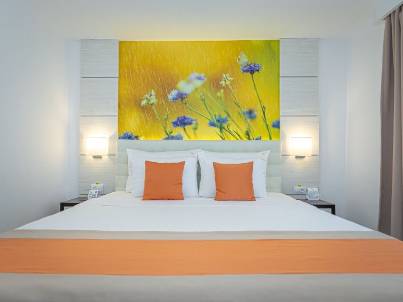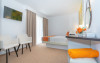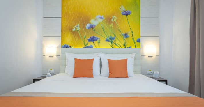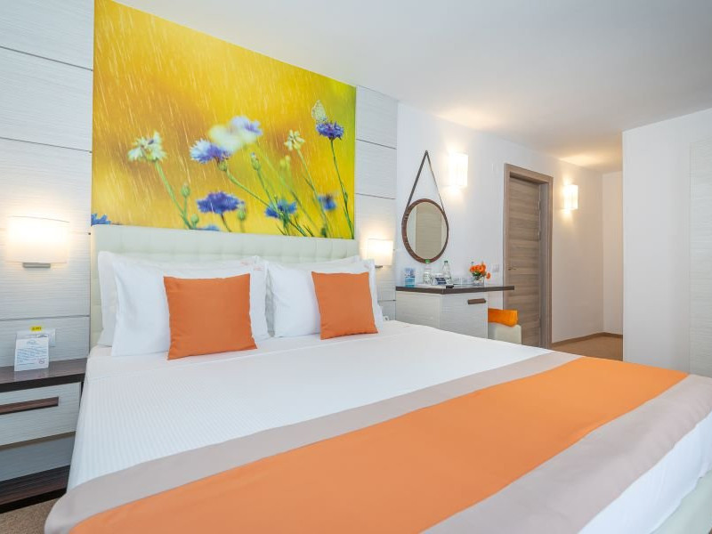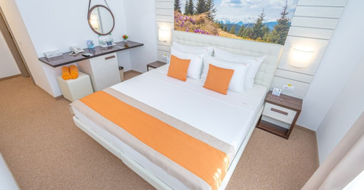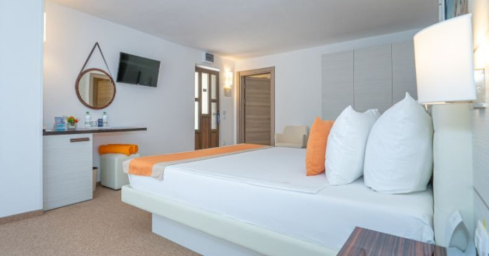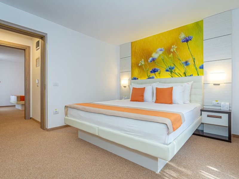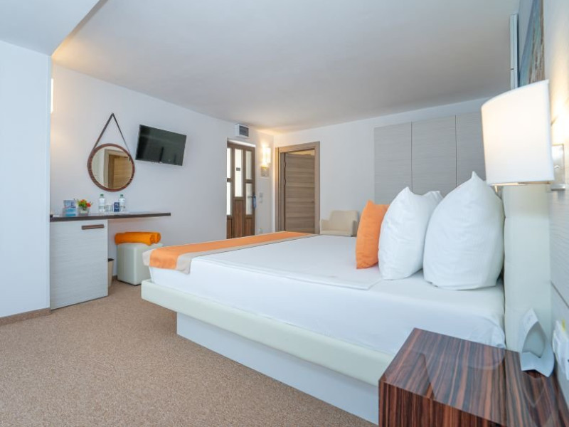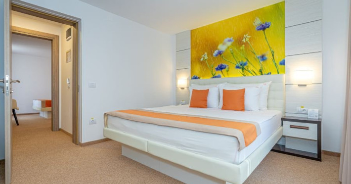 Junior Suite, cu o suprafata de 28.44 mp, sunt alcatuite din living cu canapea extensibila 160x200 cm) si dormitor cu pat matrimonial (180x190 cm). Fiecare camera dispune de baie proprie si balcon. Pot gazdui 2 adulti si 2 copii sau 3 adulti. Nu se accepta adaugarea de pat suplimentar.