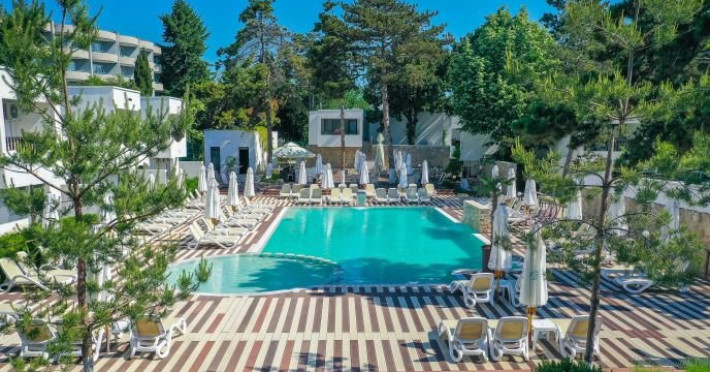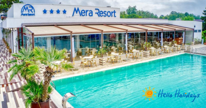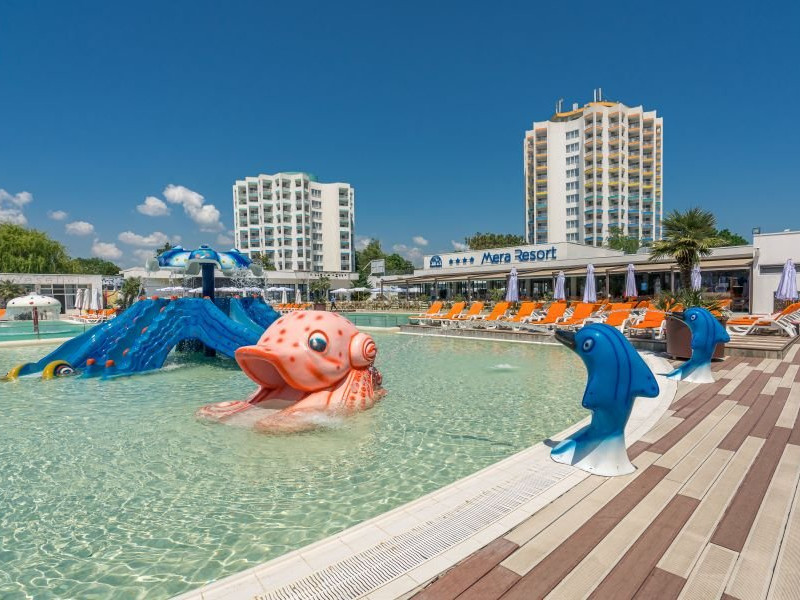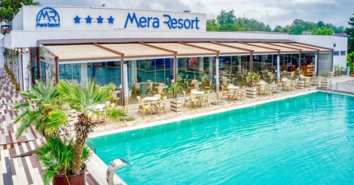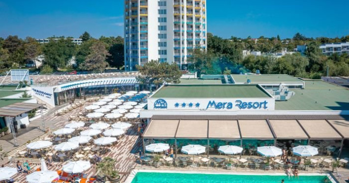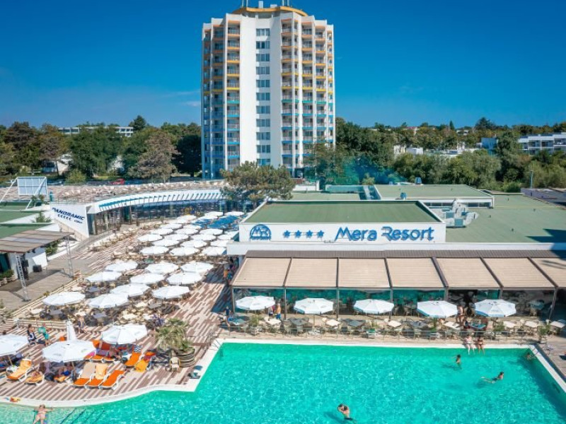 Hotelul Mera Resort dispune de plaja privata.HOTEL MERA RESORT situat in centrul statiunii Venus, este alcatuit din 2 corpuri de hotel - Mera Sky si Mera Blue - si un complex de 49 de vile cu accente mediteranene - Mera Villas.Cu 525 de spatii de cazare si un total de 1050 de locuri de cazare.