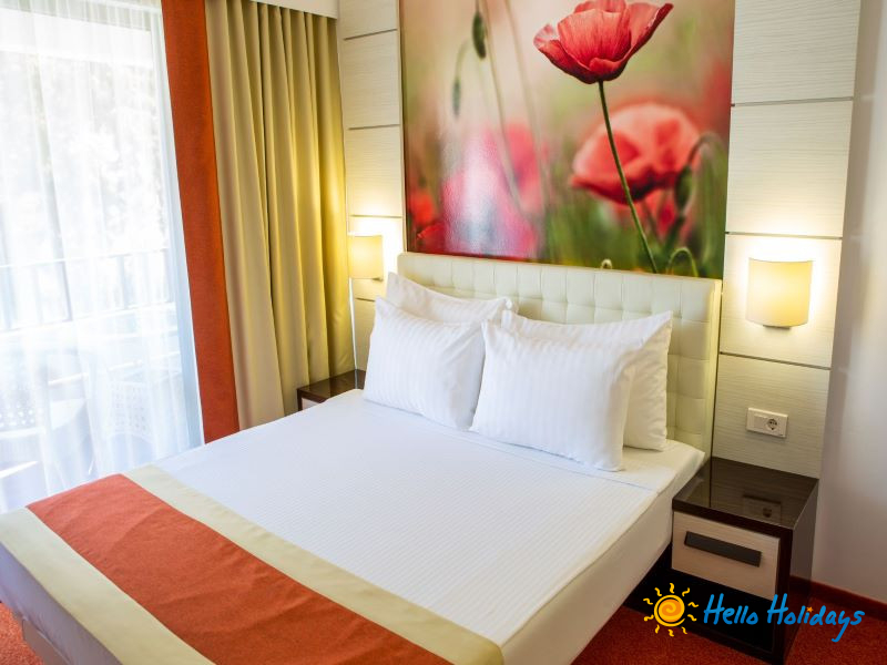 Camerele duble cu o suprafata de 15,20 mp, pat matrimonial (180/190 cm) sau 2 paturi twin (80/190 cm), sistem de acces pe baza de cartela, baie cu dus, aer conditionat, balcon cu scaune si masuta, seif, televizor LCD, internet,, telefon, minibar (produse contra cost), uscator de par, cosmetice hoteliere, prosoape pentru plaja, uscator de rufe, mocheta. Camerele duble cu doua paturi (twin) sunt situate doar la parter.