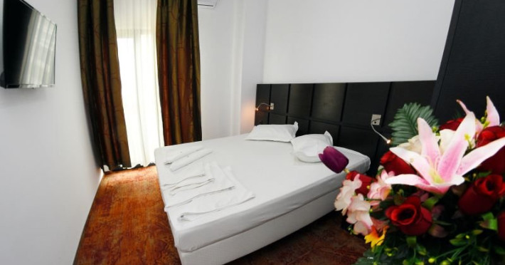 Camera dubla cu terasa interioara e dotata cu un pat matrimonial (160x200), televizor, wi fi, minibar, aer conditionat, baie cu dus, uscator de par si cosmetice hoteliere. Are terasa, si este situata pe partea din spate a hotelului.