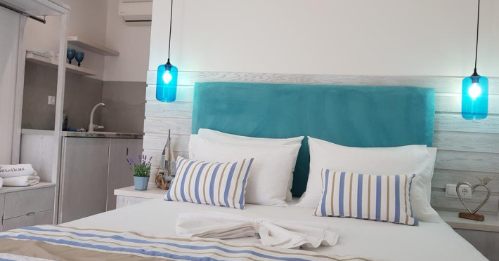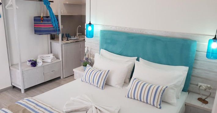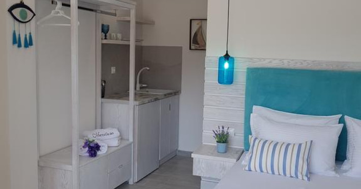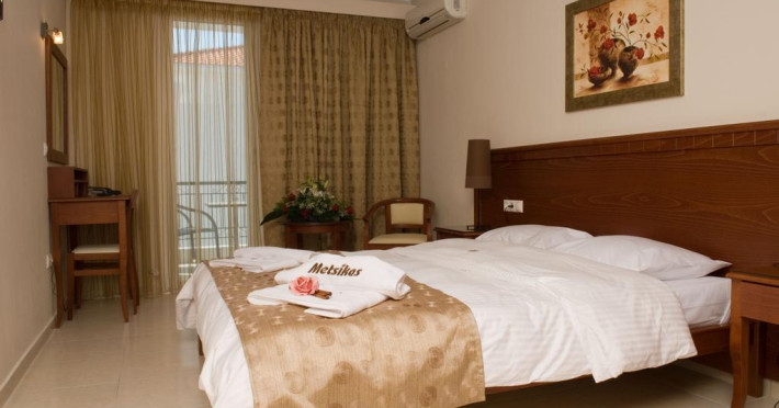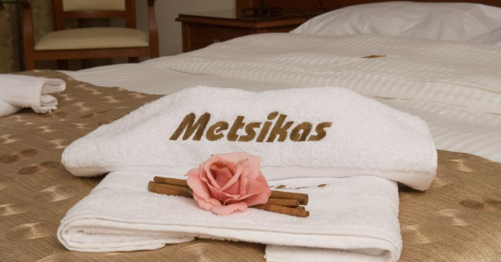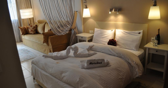 Sunt disponibile 15 camere. Unele camere au balcon cu vedere la mare sau la piscină. Camerele confortabile de la Metsikas Residence au pardoseală de gresie/ marmură, aer condiționat, Tv cu canale prin satelit și seif. În camere există baie cu cadă sau duș ce are în dotare foehn și articole de toaletă gratuite. Fiecare cameră dispune de minibar. Oaspeții pot solicita serviciul de room service pentru a servi masa sau diverse băuturi. Oaspeții au acces gratuit la serviciul Wi-fi în camere. Curățenia in cameră se face zilnic. Toate camerele spațioase de la Metsikas Residence au zonă de relaxare cu canapea, ceea ce oferă un plus de confort. Fiecare unitate de cazare include o chicinetă utilată cu frigider și ustensile de bucătărie. De asemenea, este disponibilă o zonă de luat masa. Proprietatea oferă camere pentru familie cu o suprafață mai mare și un număr mai mare de paturi față de cele standard. Se pot rezerva de asemenea camere pentru nefumători.