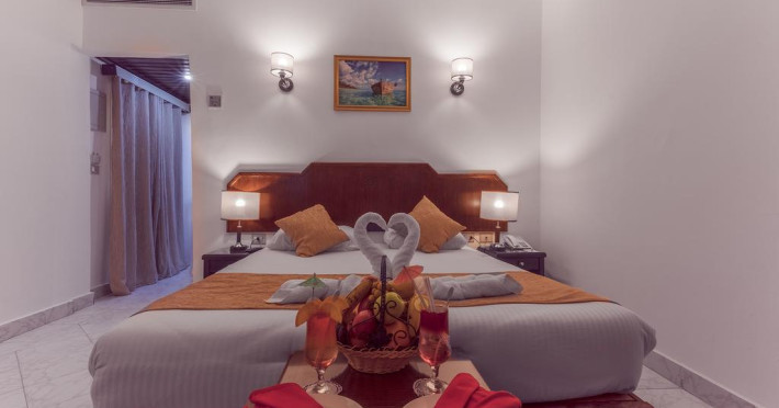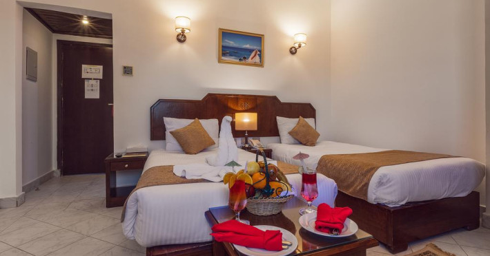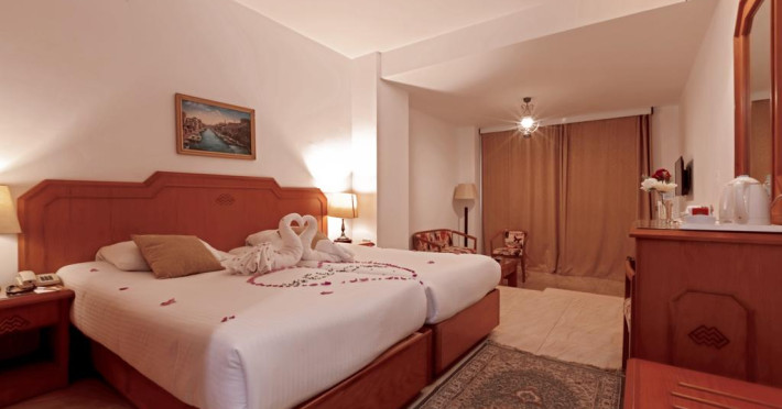 Hotelul dispune de un numar de 298 de camere , cu mobilier elegant de lemn in stil clasic egiptean, dotate cu uscator de par, televizor, telefon, minibar (contra cost), aer conditionat. Unele camere au vedere la mare și la piscină, iar altele au vedere la grădină sau la oraș.