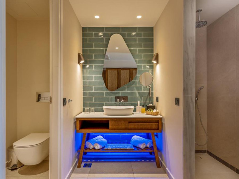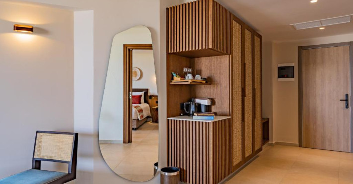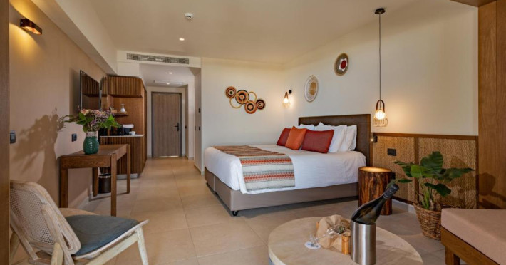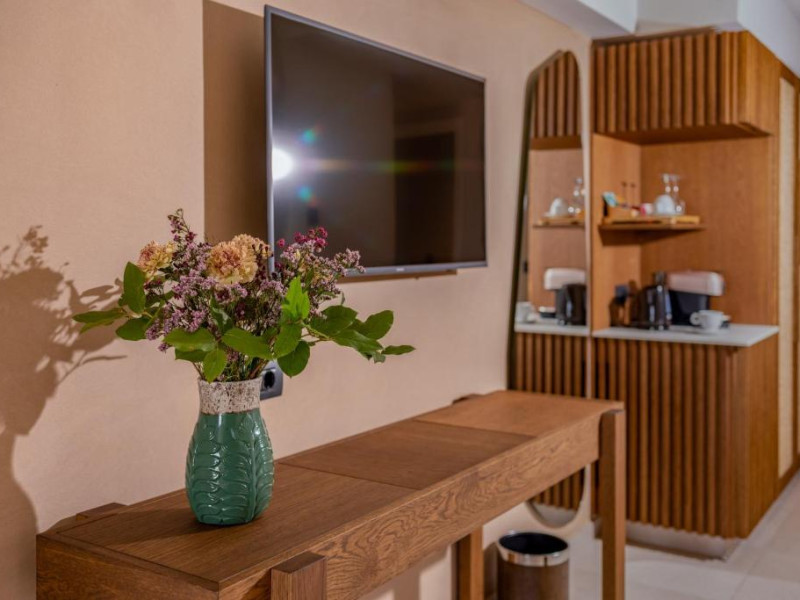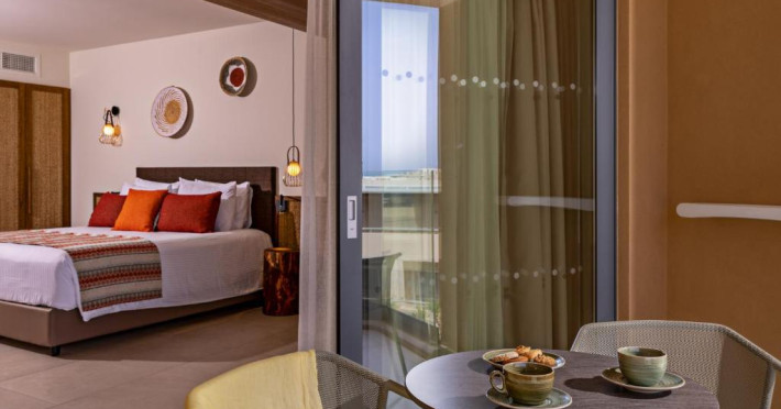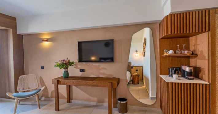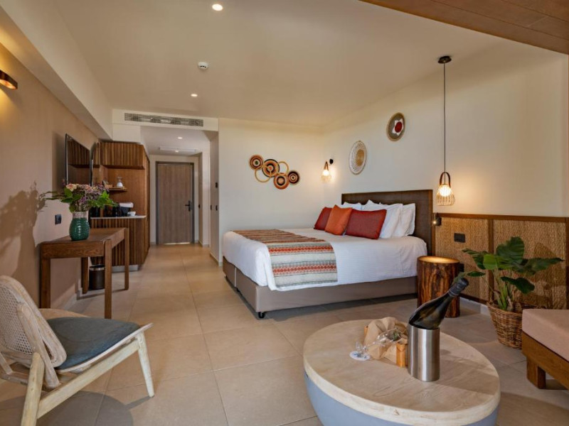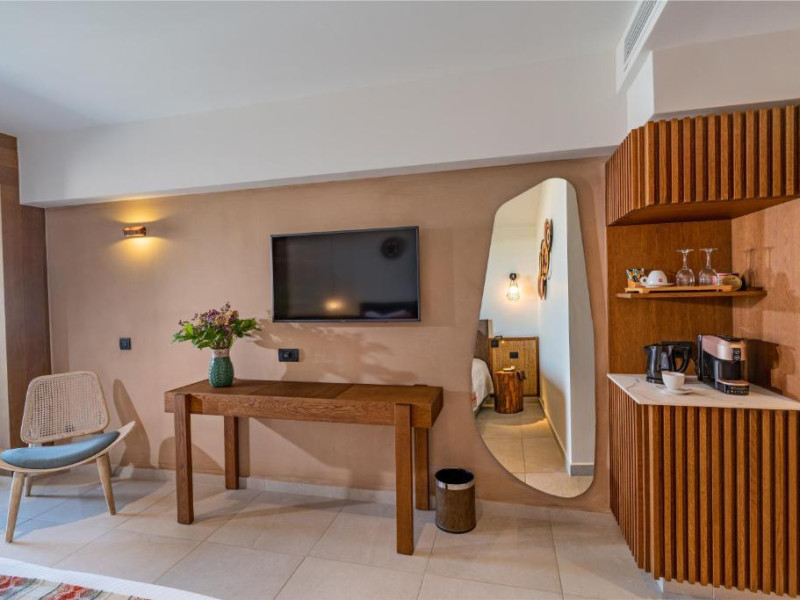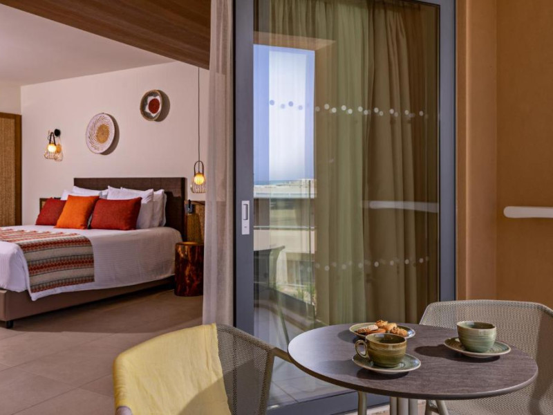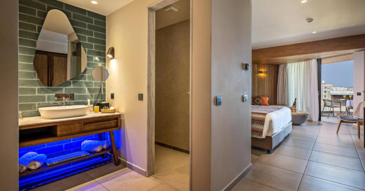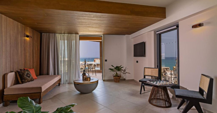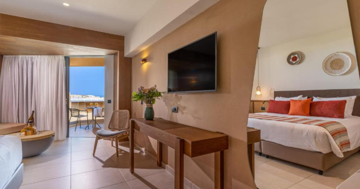 Camerele elegante beneficiază de design contemporan și balcoane private, multe dintre ele cu vedere spre Marea Egee. Facilitățile premium includ un centru spa sofisticat cu tratamente de relaxare, o piscină infinity cu șezlonguri confortabile și un restaurant à la carte care servește specialități mediteraneene autentice.