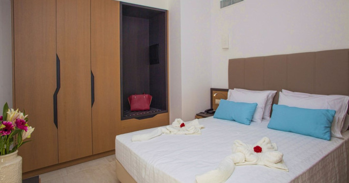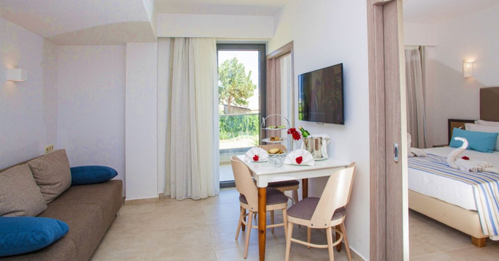 Sunt disponibile 36 camere. Unele camere au balcon cu vedere la mare, unde oaspeții pot admira apusul sau răsăritul soarelui. În camere există baie cu cadă sau duș ce are în dotare foehn și articole de toaletă gratuite. Fiecare cameră dispune de cană-fierbător. Camerele confortabile de la Minos Aparthotel au pardoseală de gresie/ marmură, aer condiționat, Tv cu canale prin satelit și seif. Oaspeții au acces gratuit la serviciul Wi-fi în camere. Curățenia in cameră se face zilnic. În fiecare unitate de cazare există o bucătărie utilată cu frigider, plită de gătit și ustensile de bucătărie. De asemenea, sunt disponibile un cuptor pentru prepararea mâncării și o masă unde oaspeții pot mânca. Proprietatea oferă camere pentru familie cu o suprafață mai mare și un număr mai mare de paturi față de cele standard.