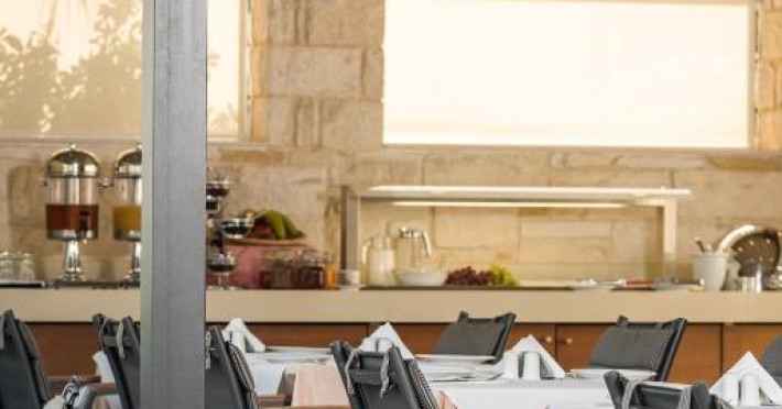 La Minos Village oaspeții au la dispoziție un restaurant care servește mâncare à la carte. Masa poate fi servită atât în interior, cît si în aer liber, pe terasă, în funcție de vreme. Minos Village servește zilnic un mic dejun tip bufet în zona de luat masa. Oaspeţii pot avea diverse băuturi răcoritoare sau alcoolice la bar. Oaspeţii îşi pot pregăti micul dejun şi alte mese şi le pot savura chiar pe balcon.
