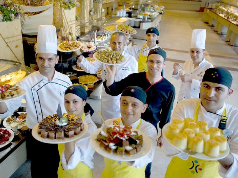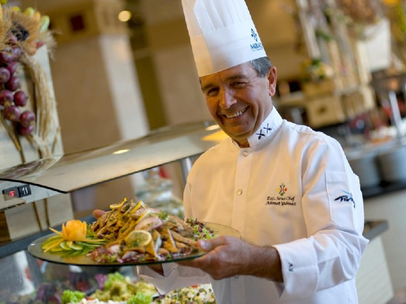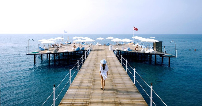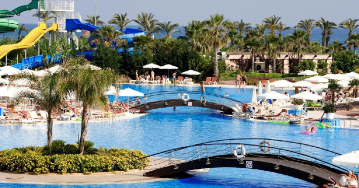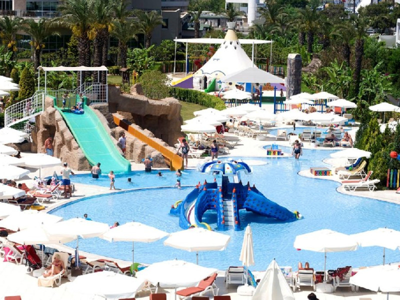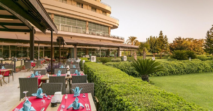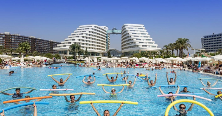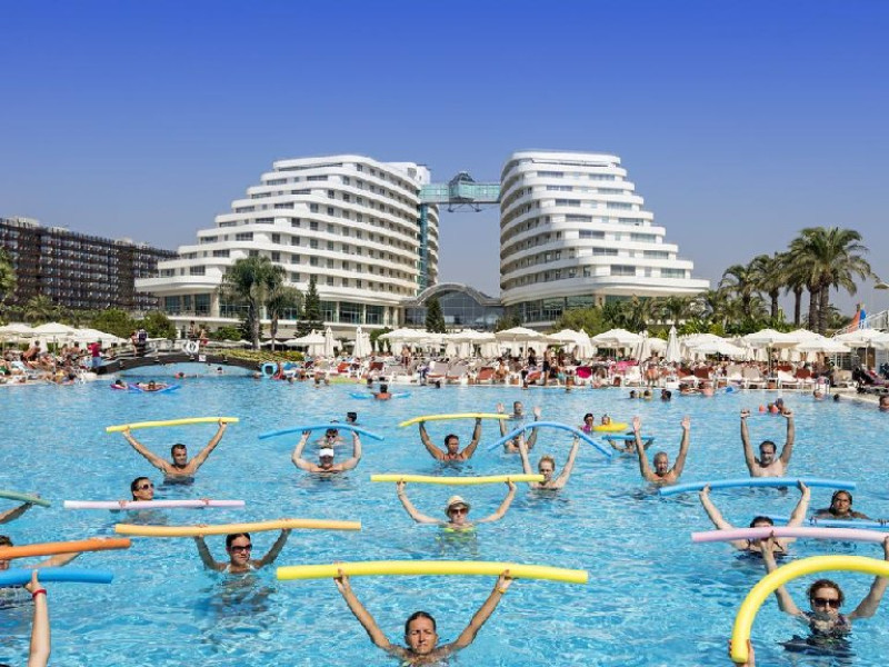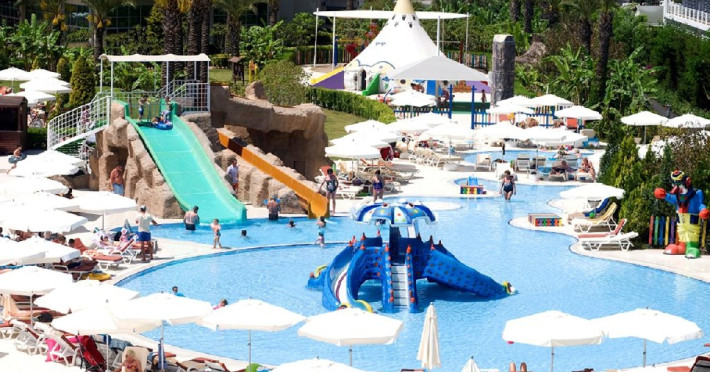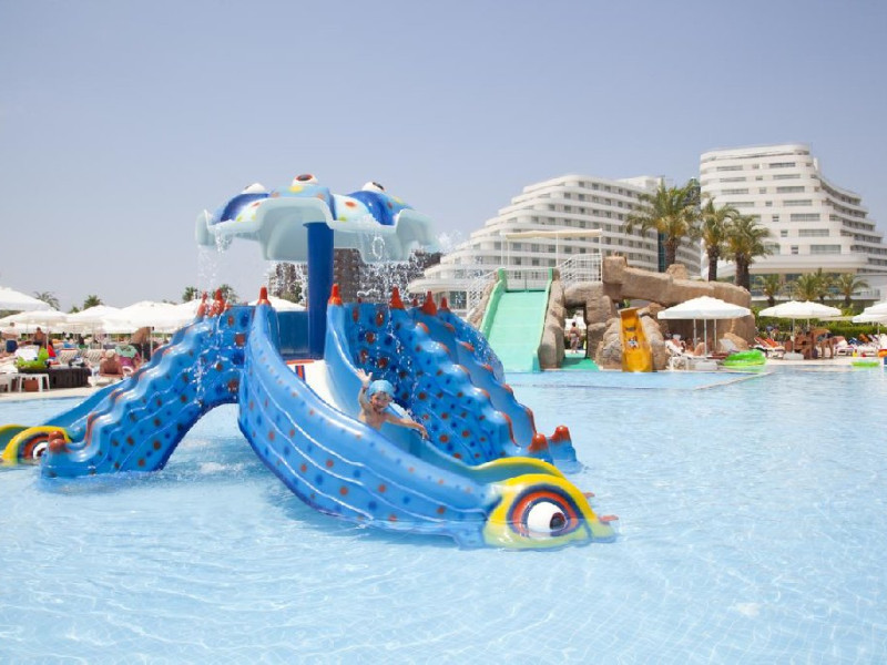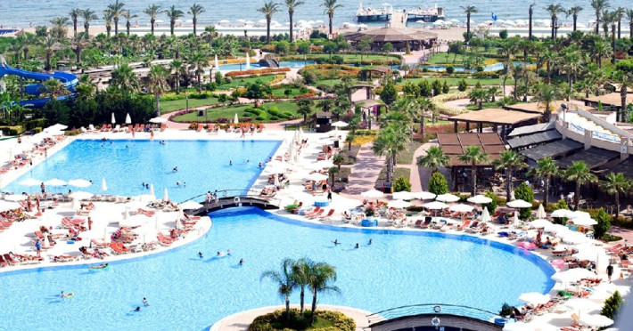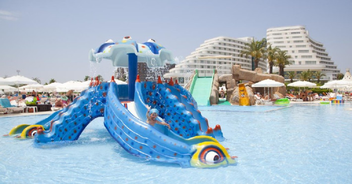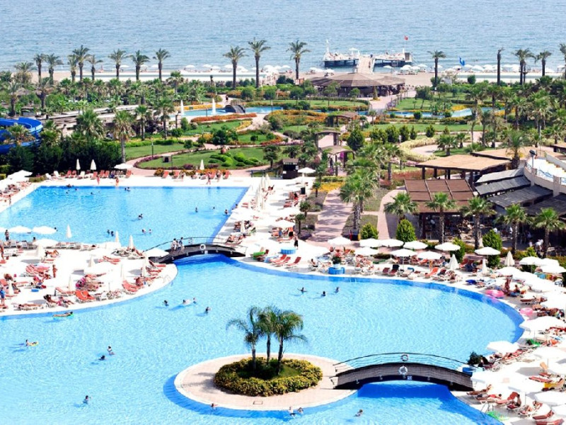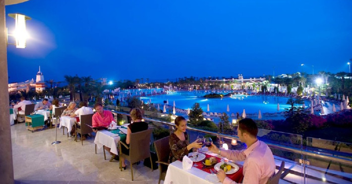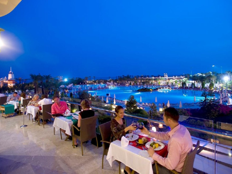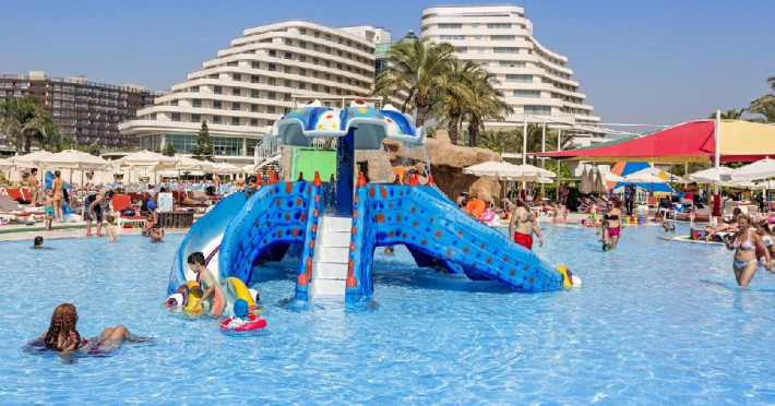 Facilitati hotel: Hotelul dispune de restaurant principal, patru restaurante a la carte, sase baruri, piscina interioara incalzita in sezonul de iarna, piscine exterioare pentru adulti si copii, aquapark cu trei tobogane pentru adulti si doua tobogane pentru copii, hammam, sauna, baschet, tenis de masa, volei pe plaja, mini fotbal, mini golf, aerobic, centru de fitness, jocuri de societate, darts, tragere cu arcul si pusca cu aer comprimat, animatie, spectacole seara, discoteca, cinema, mini club, midi club, club pentru adolescenti, mini bufet pentru copii, internet wireless, sali de conferinta.
