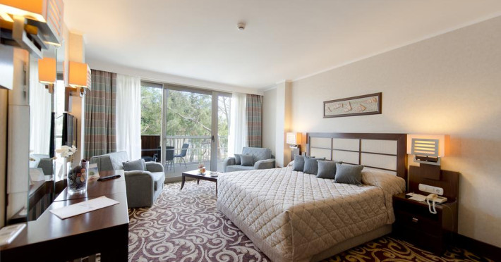 Hotelul are un numar total de 542 camere, 3 tipuri de camere standard: 285 camere in cladirea principala (26 mp, max 2+1pers), 110 camere standard in cladirea Garden (32 mp, max 2+1pers); 94 camere in aripa cladirii principale (30 mp, max 2+1pers), 29 camere triple (32 mp, max 2+2pers), 12 camere family (48 mp, doua dormitoare cu usa despartitoare intre ele, o baie, max 4 pers), 4 camere tip suita (50 mp, un dormitor si un living, vedere la mare), 4 camere pentru persoane cu dizabilitati. Camerele pot avea vedere la mare, piscina, gradina sau munte. Toate camerele sunt dotate cu baie privata cu cada si dus, uscator de par, aer conditionat centralizat, telefon direct, mini-bar (bauturi racoritoare si apa la sosire), seif, satelit TV si canale muzica, mocheta, balcon.