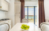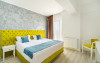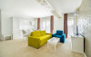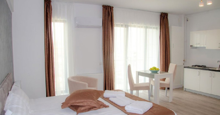 Junior Suite cu balcon cu o suprafata de 80 mp dispune de dormitor cu pat matrimonial, baie cu cada, bucatarie utilata si living cu canapea extensibila. Balcon cu vedere spre mare, lac sau oras