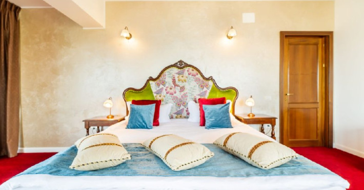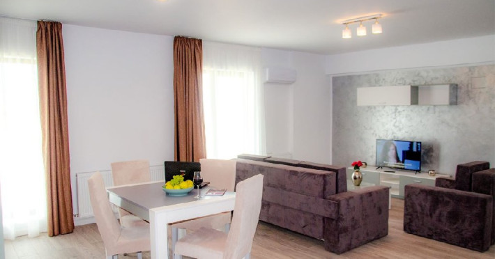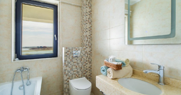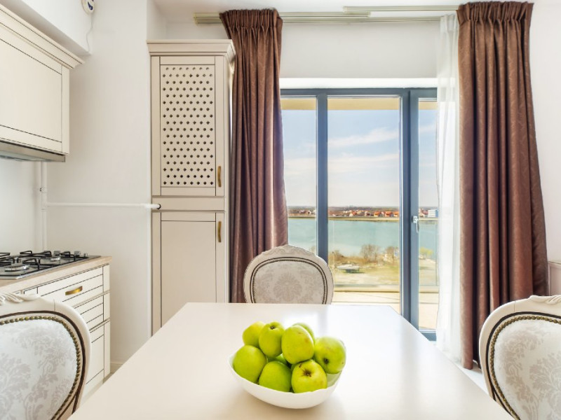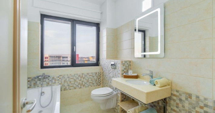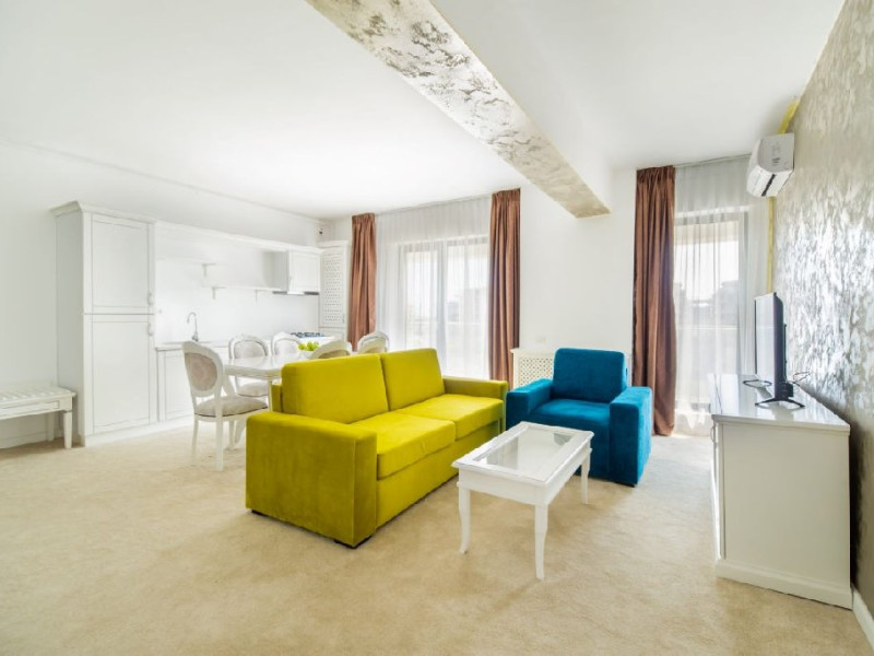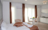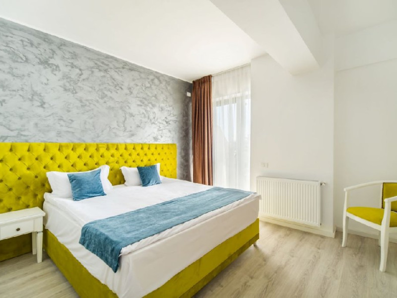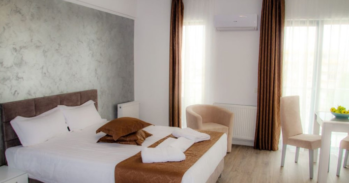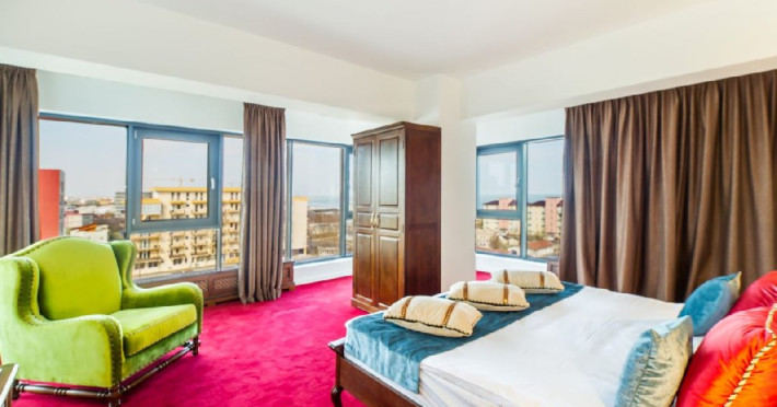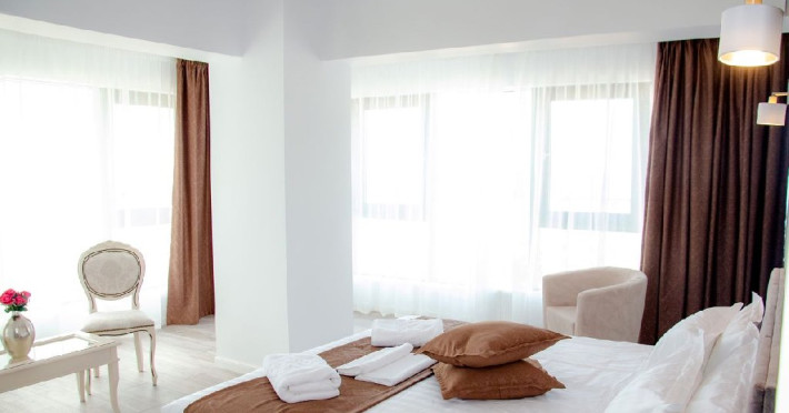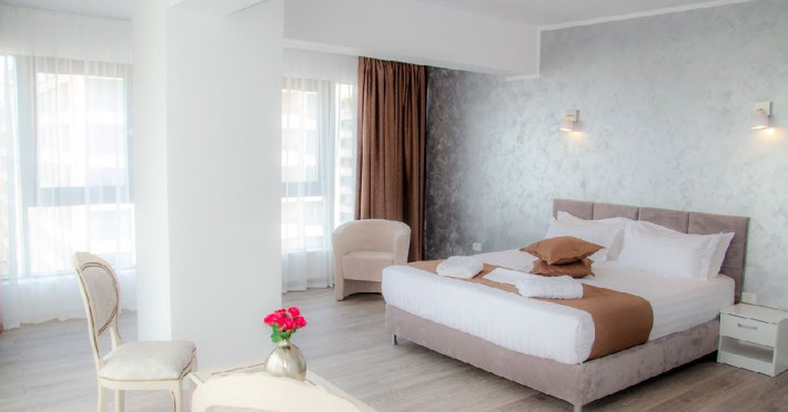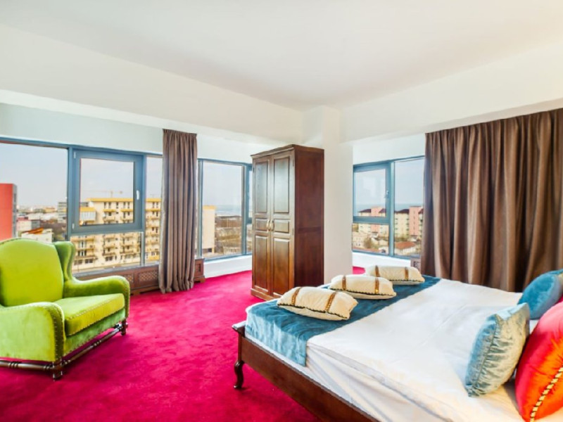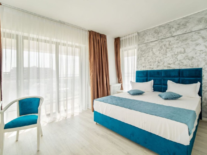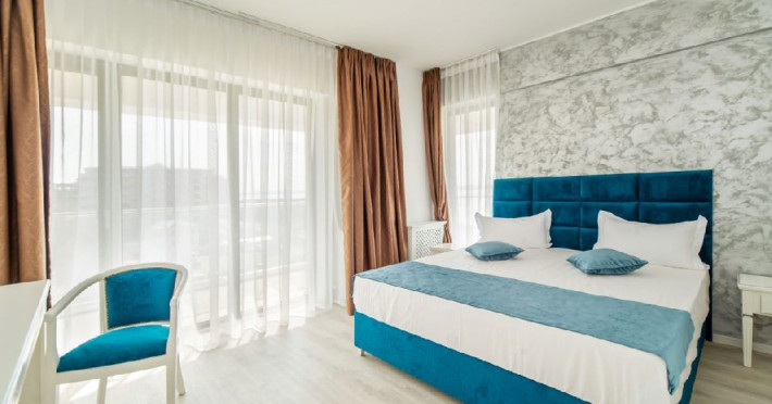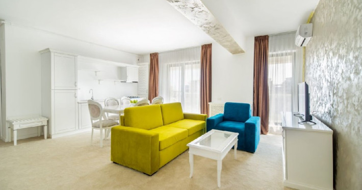Junior Suite cu balcon cu o suprafata de 80 mp dispune de dormitor cu pat matrimonial, baie cu cada, bucatarie utilata si living cu canapea extensibila. Balcon cu vedere spre mare, lac sau oras