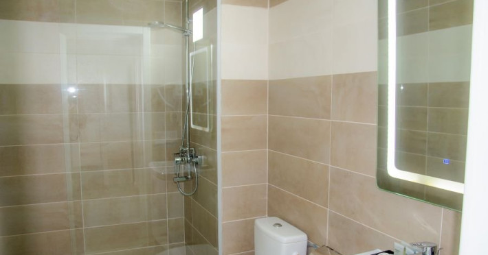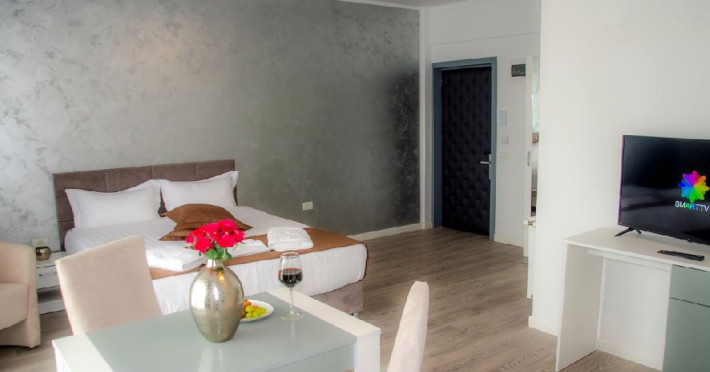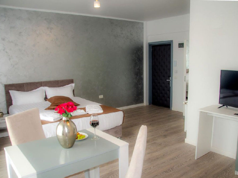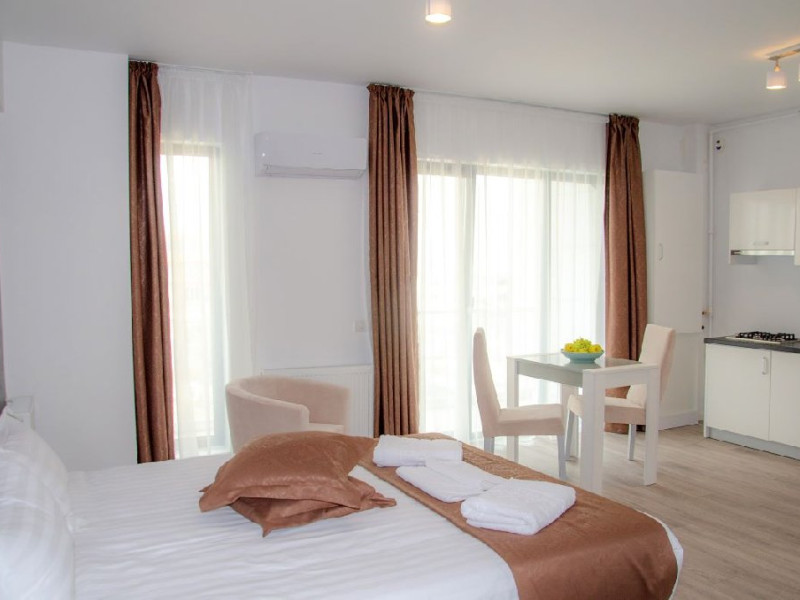 Garsoniera cu o suprafata de 40 mp dispune de un pat matrimonial de 160 x 200 si o bucatarie cu zona de pregatit si de luat masa, aparat de cafea si ceai, balcon cu vedere spre mare, lac sau oras, aer conditionat, Tv, baie cu dus, uscator de par.