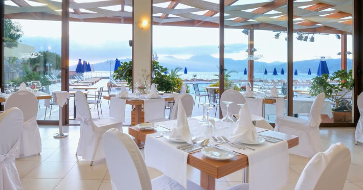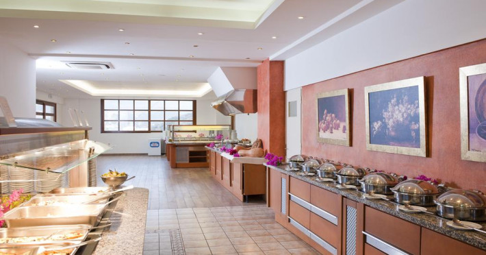 La Miramare Resort oaspeții au la dispoziție un restaurant care servește mâncare în stil bufet. Preparate din bucătăria grecească și internațională așteaptă să fie degustate în fiecare zi la micul dejun, prânz și cină. Masa poate fi servită atât în interior, cît si în aer liber, pe terasă, în funcție de vreme. Oaspeţii pot avea diverse băuturi răcoritoare sau alcoolice la bar. De asemenea , în cadrul proprietății, există cafenea și snack bar ideale pentru o gustare rapidă. Pentru cei cu anumite nevoi de nutriție, Miramare Resort oferă meniuri pentru diete speciale.