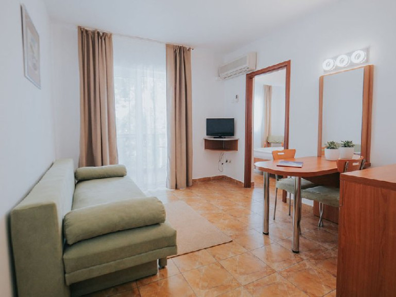 Apartamentul are o suprafata totala de 42 mp si dispune de un living spatios cu vedere frontala spre mare, dotat cu canapea extensibila, dormitor cu pat matrimonial, baie de 6mp cu cada.