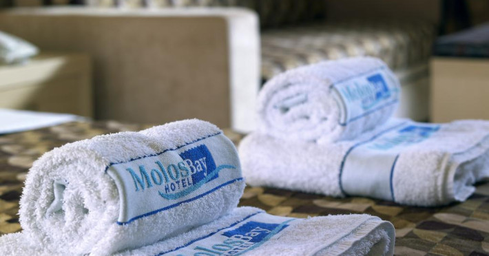 Sunt disponibile 45 camere. În camere există baie cu cadă sau duș ce are în dotare foehn și articole de toaletă gratuite. Fiecare cameră oferă cană-fierbător și mașină pentru prepare cafea sau ceai. Oaspeții pot solicita serviciul de room service pentru a servi masa sau diverse băuturi. Camerele confortabile de la Molos Bay au pardoseală de gresie/ marmură, aer condiționat, Tv cu canale prin satelit și seif. Unele camere au balcon cu vedere la mare sau la piscină. Oaspeții au acces gratuit la serviciul Wi-fi în camere. Curățenia in cameră se face zilnic. Fiecare unitate de cazare are frigider. Proprietatea oferă camere pentru familie cu o suprafață mai mare și un număr mai mare de paturi față de cele standard.