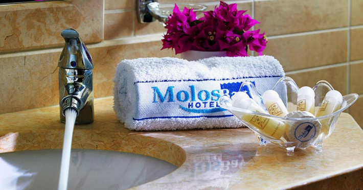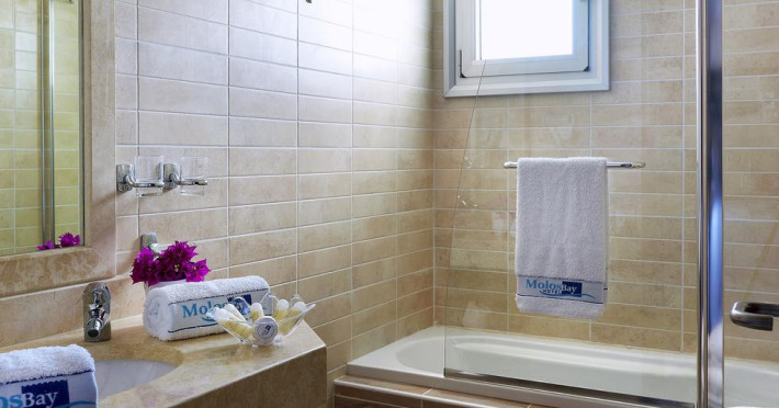 Din facilitățile oferite de proprietate nu lipsesc cele spa, unde oaspeții pot încerca diferite tratamente de înfrumusețare sau se pot relaxa la masaj. Molos Bay are în dotare cadă cu hidromasaj. Pentru cei interesați proprietatea oferă servicii de manichiură & pedichiură. În cadrul proprietatății există piscină în aer liber pentru cei care doresc să se relaxeze și să se bronzeze. Aceasta este prevăzută cu șezlonguri confortabile, prosoape și umbrele de soare. Proprietatea are o piscină care oferă o vedere panoramică asupra întregii zone