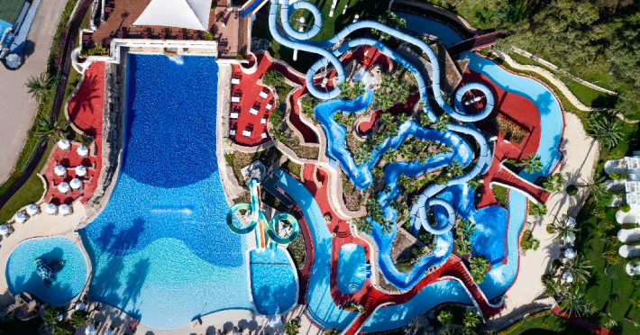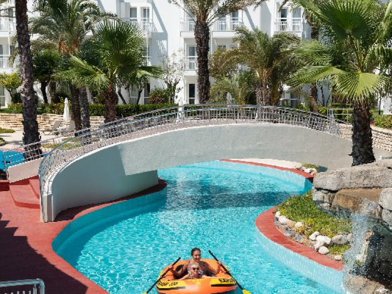 Facilitati hotel: Hotelul ofera oaspetilor sai urmatoarele facilitati: restaurant principal in regim de bufet suedez, patiserie, snack bar la plaja, 2 restaurante a la carte cu specific turcesc si asiatic pentru care se solicita rezervare care este gratuita, 1 restaurant cu specific pescaresc la care rezervarea costa 15 euro/pers, 7 baruri, cafenea, discoteca, 5 piscine exterioare pentru adulti, 2 piscine cu tobogane, 2 piscine pentru copii, 2 terenuri de tenis cu teren sintetic, tenis de masa, muzica live, darts, volei pe plaja, centru fitness, sauna, tir cu arcul, baie turceasca, sali de conferinta cu plata, polo pe apa, camera de joaca, cinema, loc de joaca, animatie, mini disco, piscina pentru copii umbrita, plasa pentru tantari, mancare speciala pentru copii.