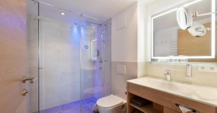 Spa and wellness facilities including a spa centre and a sauna are at guests' disposal during their stay at the accommodation. The spa facilities include an all-year outdoor pool with countercurrent system, a panoramic acacia sauna and deluxe sanarium (both with coloured lighting), an ice fountain, and a relaxation lounge with water beds. A solarium is available for a surcharge.