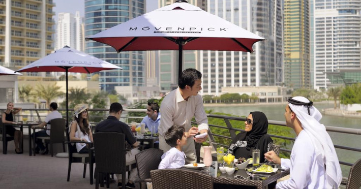 La Movenpick Jumeirah Lakes Towers oaspeții au la dispoziție 2 restaurante unde pot savura mâncăruri delicioase, în stil bufet sau à la carte. Masa poate fi servită atât în interior, cît si în aer liber, pe terasă, în funcție de vreme. Oaspeţii pot avea diverse băuturi răcoritoare sau alcoolice la bar. Pentru cei cu anumite nevoi de nutriție, Movenpick Jumeirah Lakes Towers oferă meniuri pentru diete speciale.