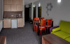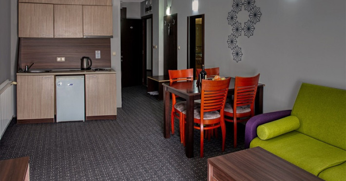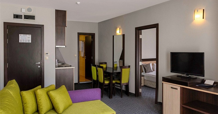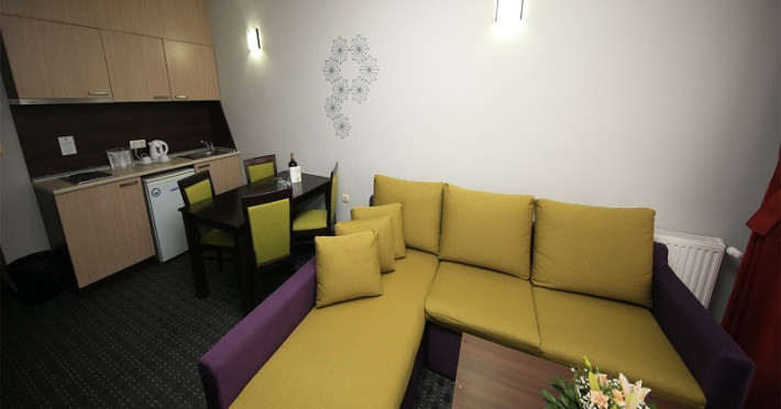Apartamentele sunt spatioase si luminoase, alcatuite dintr-un living si un dormitor separate de o usa si dispun de mini-bar, serviciu de ceai si cafea, TV cu ecran plat, wi-fi, balcon, uscator de par, schimbarea lenjeriei de pat de 2 ori pe saptamana. Capacitate: 2+2 / 3 (50mp).