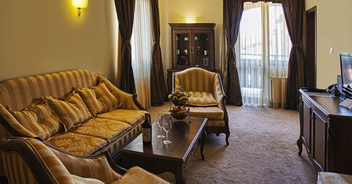 Camere spatioase si generoase, dotate cu mini-bar, televiziune prin cablu, aer conditionat, wi-fi gratuit, balcon, uscator de par, telefon, curatenie zilnica, schimbarea lenjeriei de pat de 2 ori pe saptamana. Capacitate: 2+2/3 (40 mp).