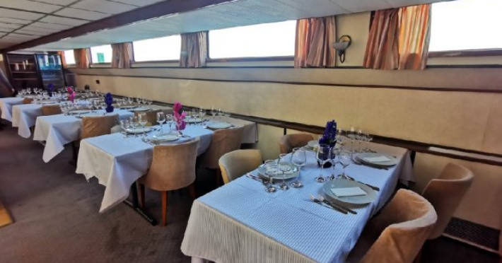 Restaurant si masa: nava dispune de un restaurant cochet cu mese de 4 sau 6 persoane, unde se poate servi masa in regim pensiune completa, mic dejun bufet, iar restul meselor in functie de preferintele turistilor (variante de meniu), cu meniu din peste sau din carne de pui/porc.
