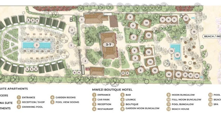 Acest complex oferă serviciu de inchiriere de autoturisme, iar zona este cunoscută printre amatorii de snorkelling și pescuit. Localitatea Kiwengwa se află la 40 km de Mwezi Boutique Resort, iar satul Paje este la 5 km de proprietate. Aeroportul Internațional Abeid Amani Karume este situat la 38 km.