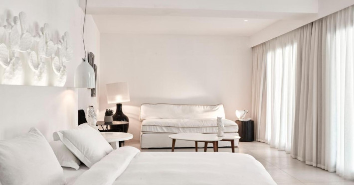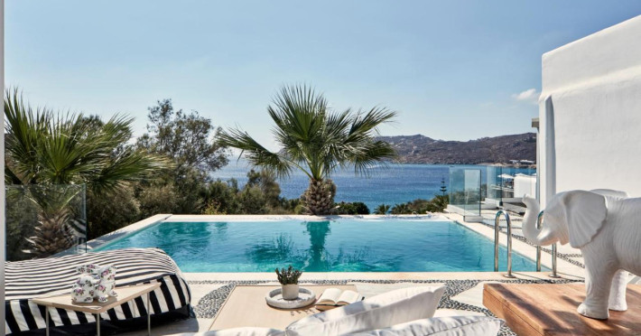 Hotelul este situat pe plaja. Aeroportul Mykonos este situat la aproximativ 10 km de complex. Oraşul pitoresc Mykonos, cu case albe în stilul insulelor Ciclade, baruri şi magazine, se află la mai puţin de 20 de minute de mers cu maşina.