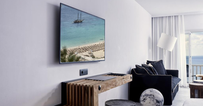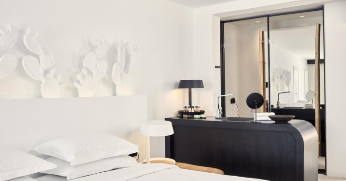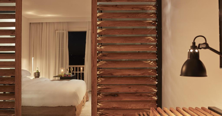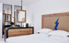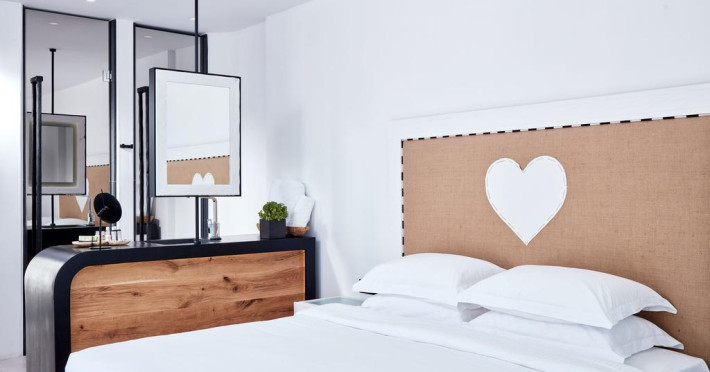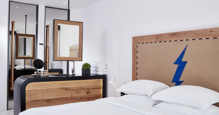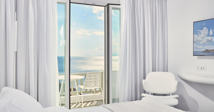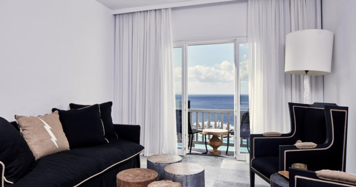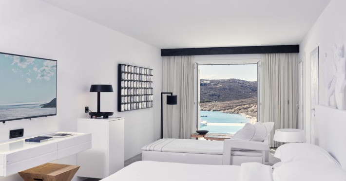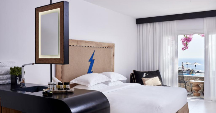 Sunt disponibile 122 camere. Unele camere au balcon cu vedere la mare, unde oaspeții pot admira apusul sau răsăritul soarelui. Fiecare cameră dispune de minibar. Oaspeții pot solicita serviciul de room service pentru a servi masa sau diverse băuturi. În camere există baie cu cadă sau duș, foehn, articole de toaletă gratuite, precum și halate de baie și papuci. Camerele luminoase de la Myconian Royal sunt dotate cu aer condiționat și Tv cu canale prin satelit. Oaspeții au acces gratuit la serviciul Wi-fi în camere. Curățenia in cameră se face zilnic.