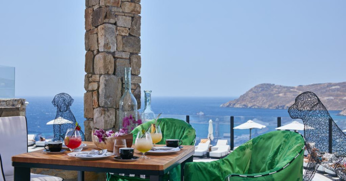 La Myconian Royal oaspeții au la dispoziție 2 restaurante unde pot savura mâncăruri delicioase, în stil bufet sau à la carte. Preparate din bucătăria grecească și internațională așteaptă să fie degustate în fiecare zi la micul dejun, prânz și cină. Masa poate fi servită atât în interior, cît si în aer liber, pe terasă, în funcție de vreme. Oaspeţii pot avea diverse băuturi răcoritoare sau alcoolice la bar.