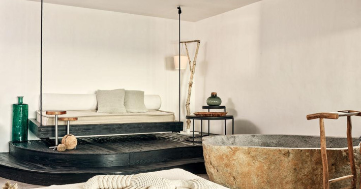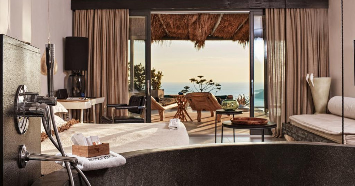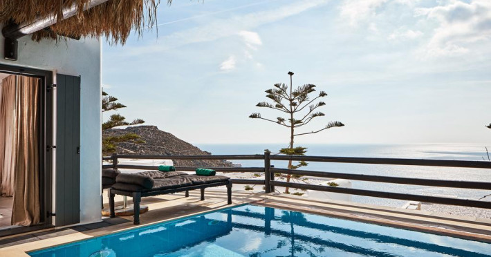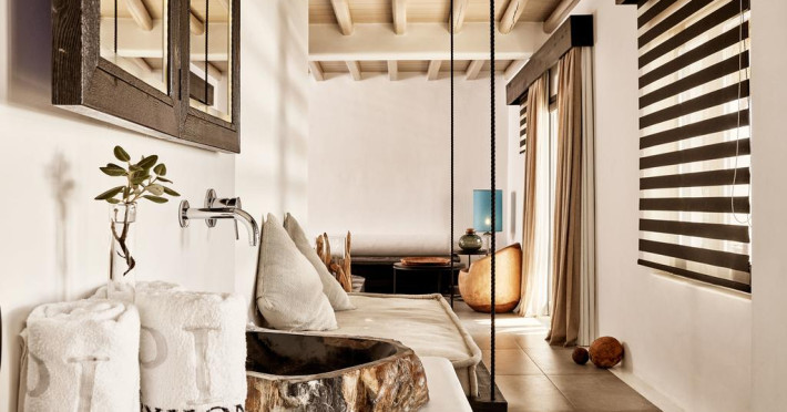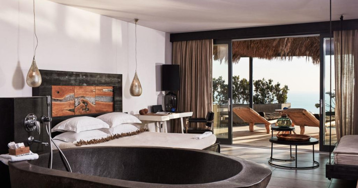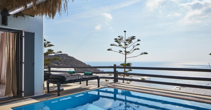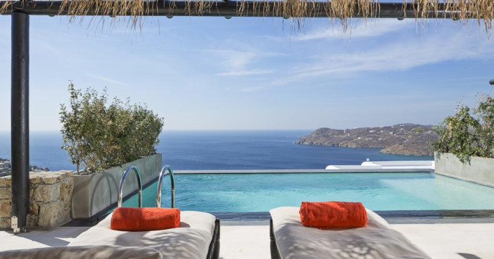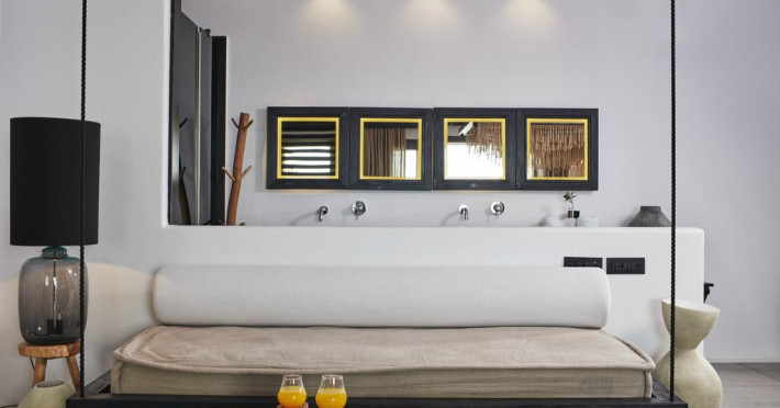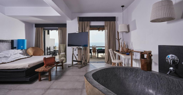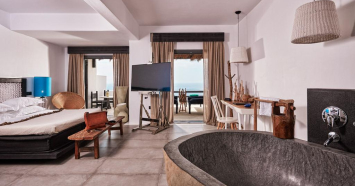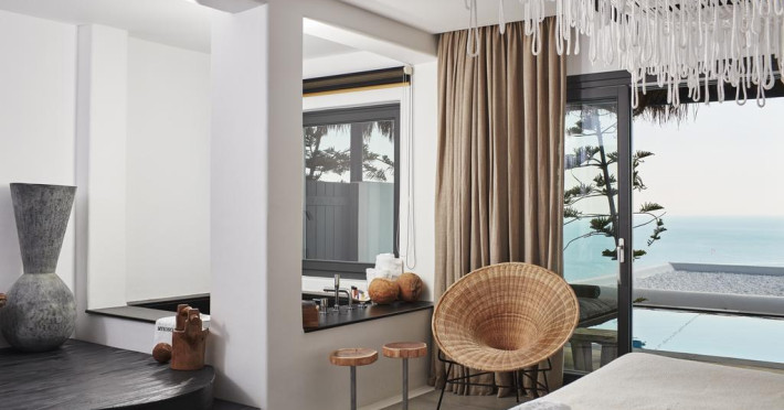Myconian Utopia Resort are în apropiere o plajă cu nisip. Pe plajă există șezlonguri și umbrele de plajă.