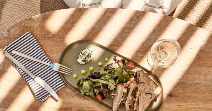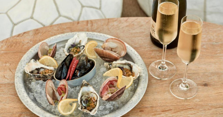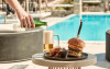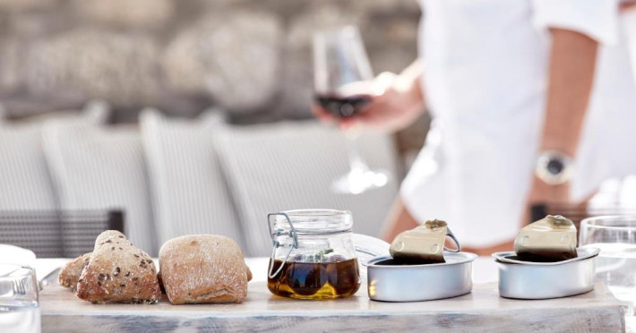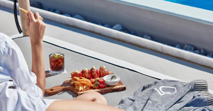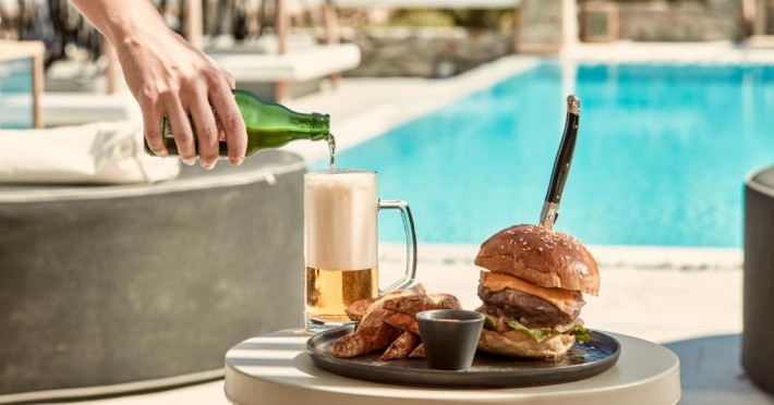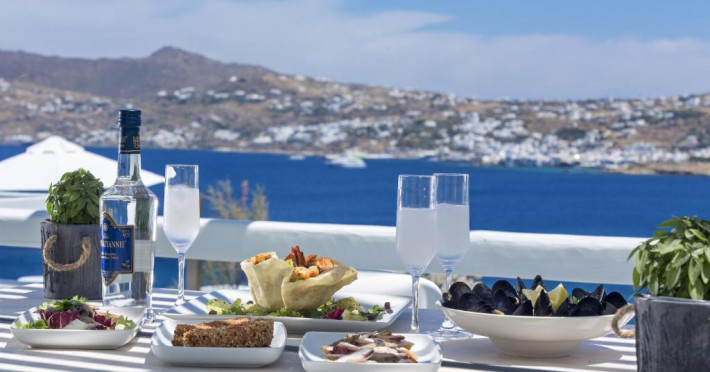 La Mykonos No 5 oaspeții au la dispoziție un restaurant care servește mâncare à la carte. Bucătăria mediteraneană de la Mykonos No 5 propune preparate delicioase care satisfac gusturi diverse. Masa poate fi servită atât în interior, cît si în aer liber, pe terasă, în funcție de vreme. Oaspeţii pot avea diverse băuturi răcoritoare sau alcoolice la bar.