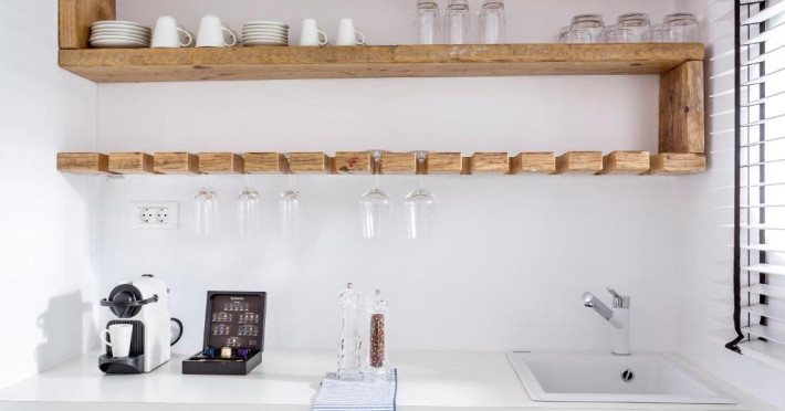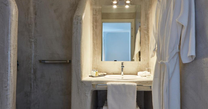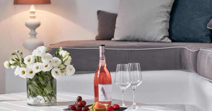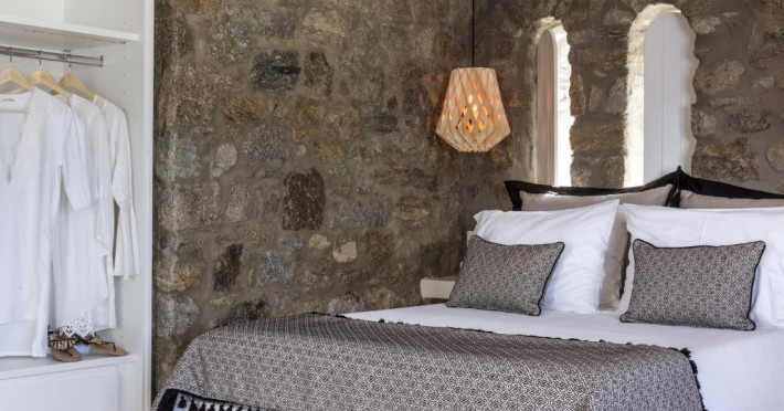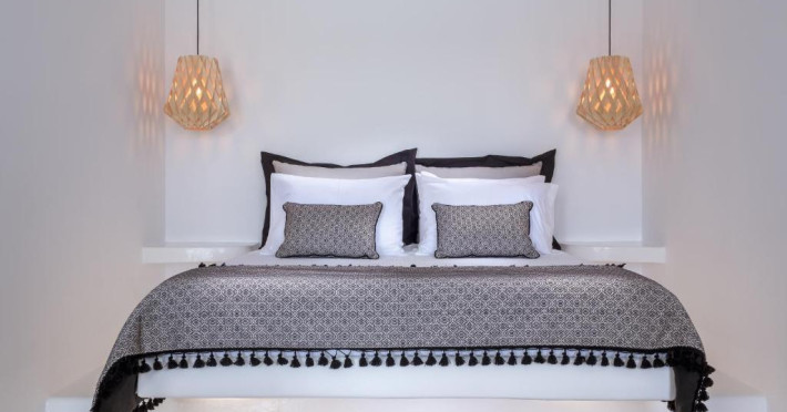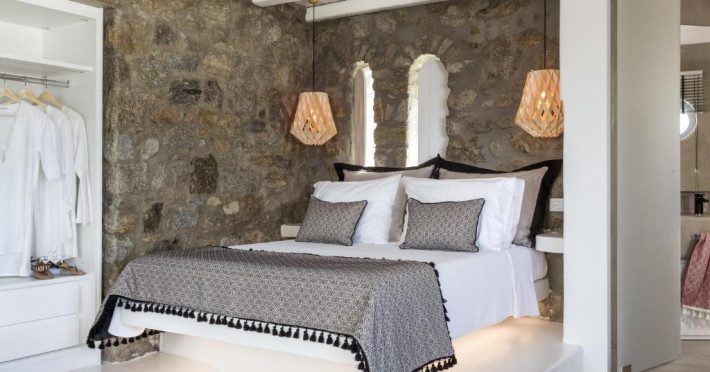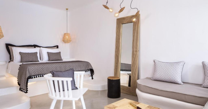 Sunt disponibile 19 camere. Un minibar și o mașină pentru preparare cafea sau ceai se află în fiecare cameră. Oaspeții pot solicita serviciul de room service pentru a servi masa sau diverse băuturi. În camere există baie cu cadă sau duș, foehn, articole de toaletă gratuite, precum și halate de baie și papuci. Camerele de la Mykonos No 5 sunt dotate cu aer condiționat, Tv cu canale prin satelit și seif. Unele camere au vedere la mare sau la piscină. Curățenia in cameră se face zilnic. Fiecare unitate de cazare include o chicinetă utilată cu plită de gătit și ustensile de bucătărie. De asemenea, este disponibilă o zonă de luat masa.