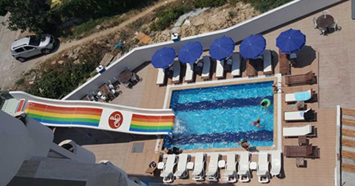 Copiii se pot distra la piscina special amenajată, prevăzută cu tobogane cu apă.
