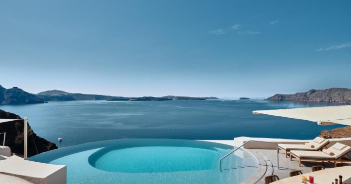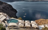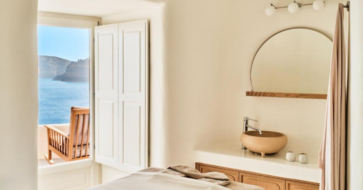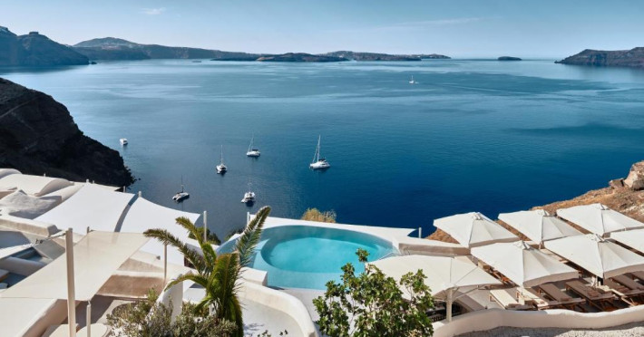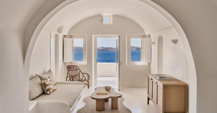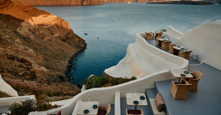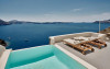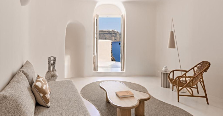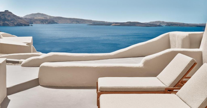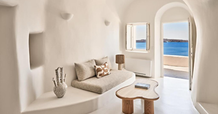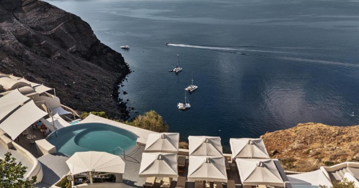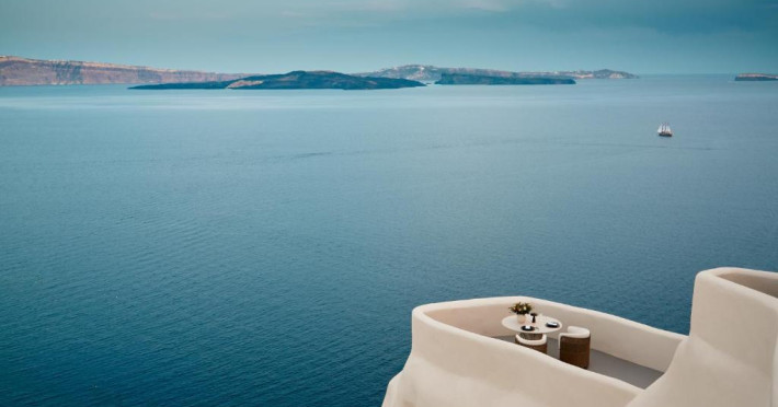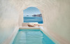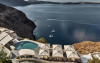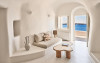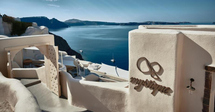 Sculptat in stancile Caldera, Mystique, a Luxury Collection Hotel, are vedere la intinderea turcoaz a Mării Egee care inconjoară insula Santorini.