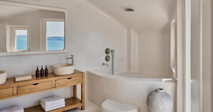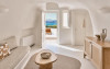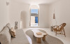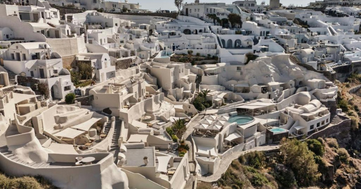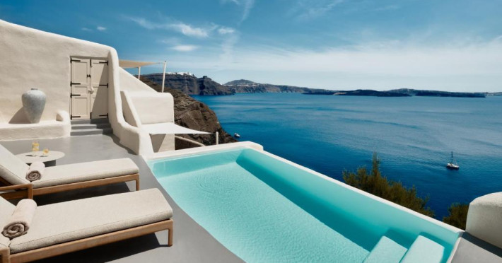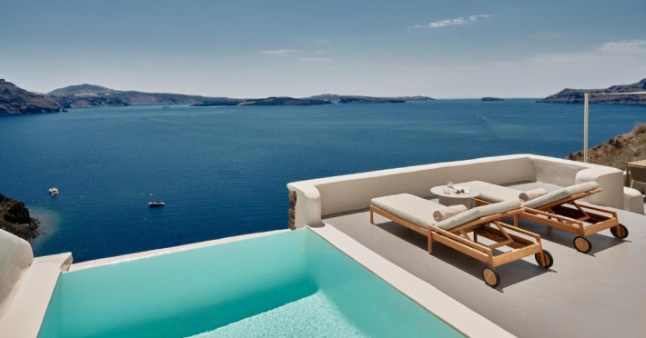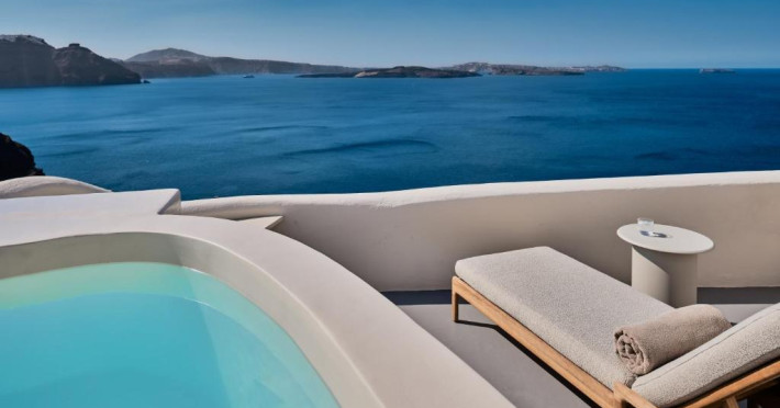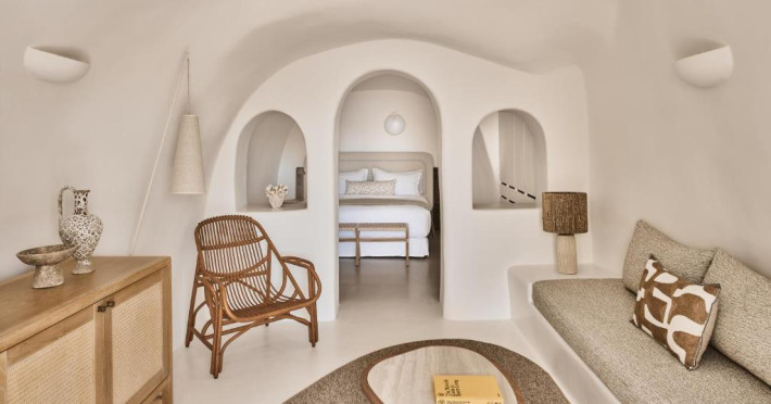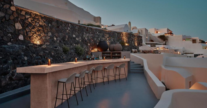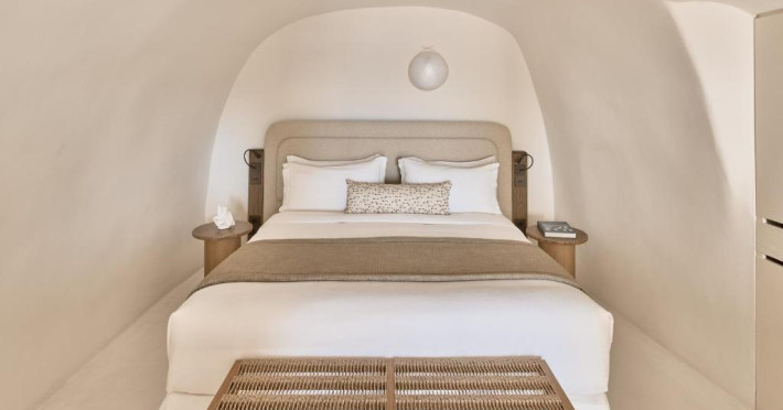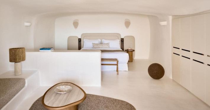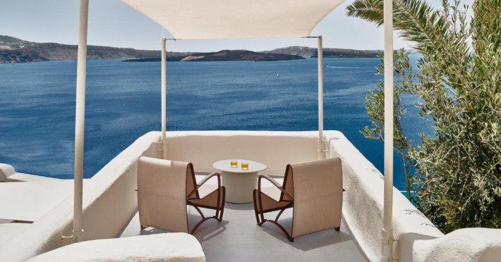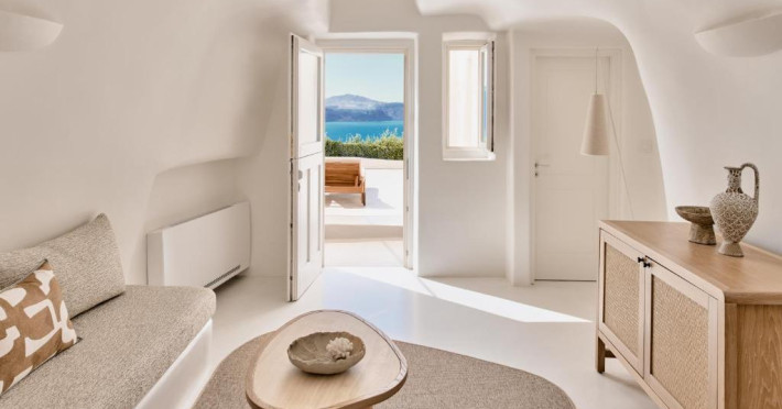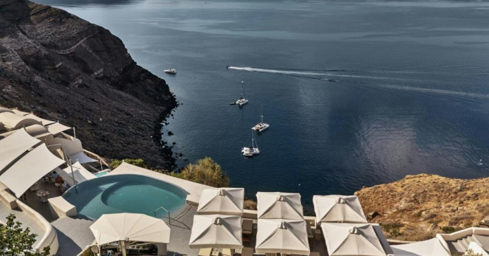 Sculptat in stancile Caldera, Mystique, a Luxury Collection Hotel, are vedere la intinderea turcoaz a Mării Egee care inconjoară insula Santorini.