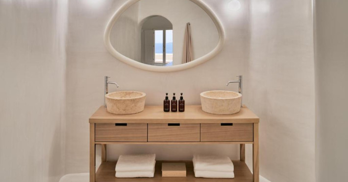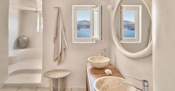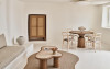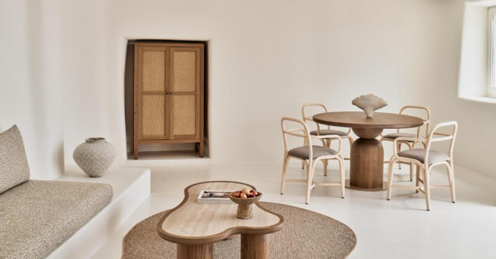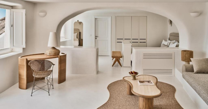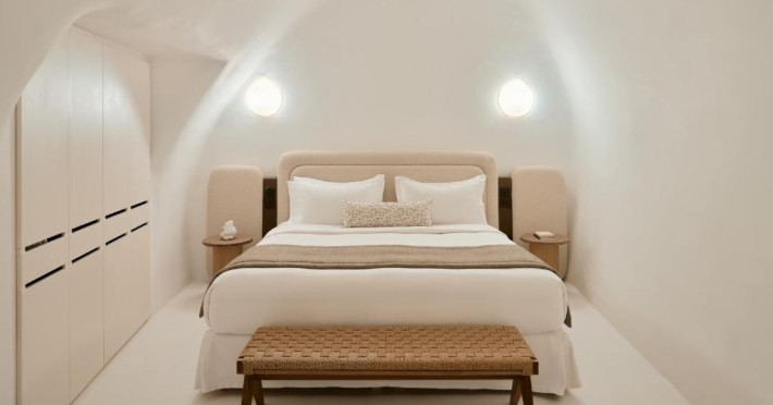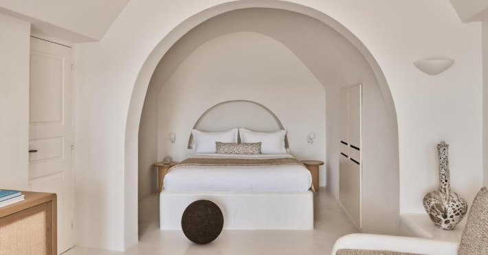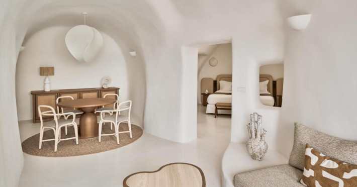 Conectate printr-o rețea de căi pietruite, toate cele 41 de apartamente și vile oferă vedere panoramică la mare, spre vulcanul activ care a modelat această insulă excepțională. Proiectat cu interioare atent ingrijite, care emană un sentiment de liniște, estetica renovată a lui Mystique imbină perfect arhitectura tradițională cicladă și luxul discret cu designul autentic și priveliștile neobstrucționate ale Mării Egee. Inspirandu-se din măiestria locală și din materialele naturale, designul modern dă o nouă viață deșeurilor ecologice. Piesele personalizate urmează forme organice, inspirate de arhitectura sculpturală din Santorini, in timp ce o colecție curată de ceramică grecească onorează bogatul patrimoniu și măiestria insulei.