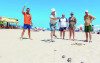 Pe plajă există șezlonguri și umbrele de plajă.