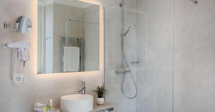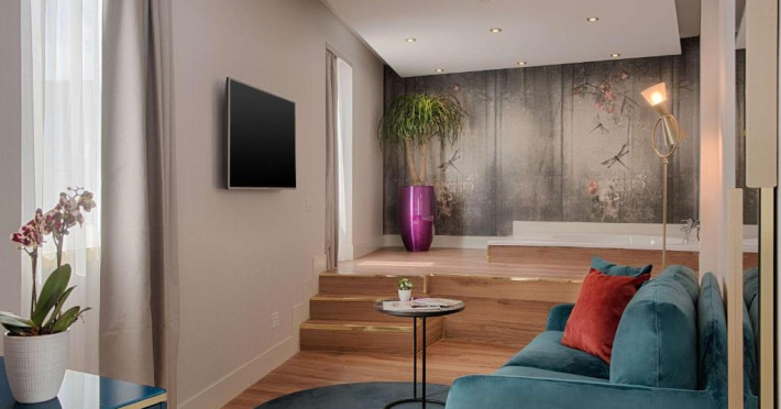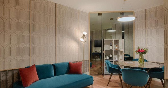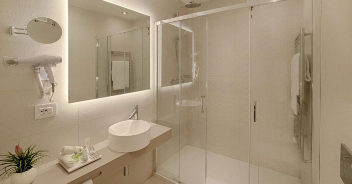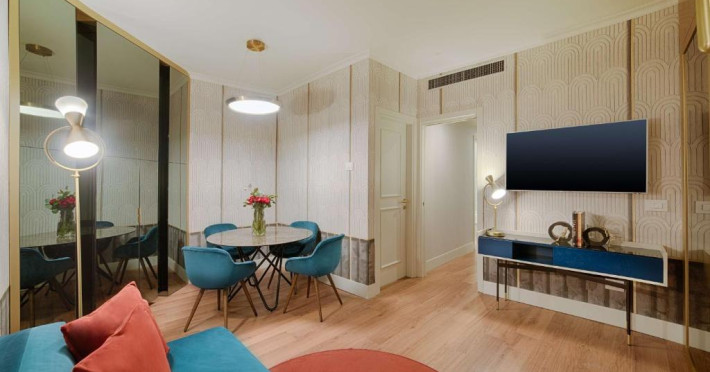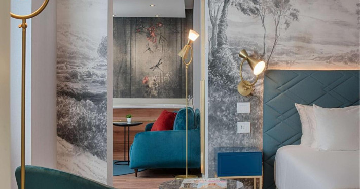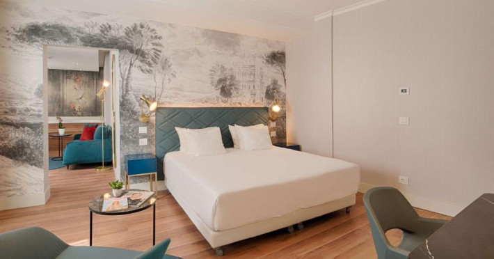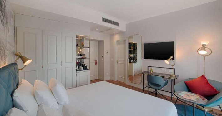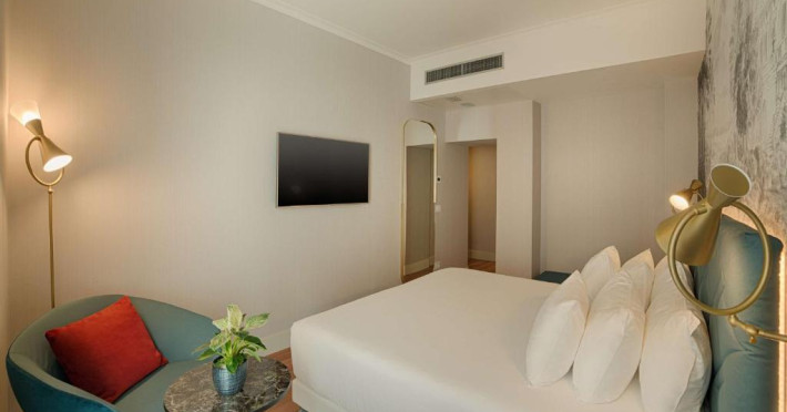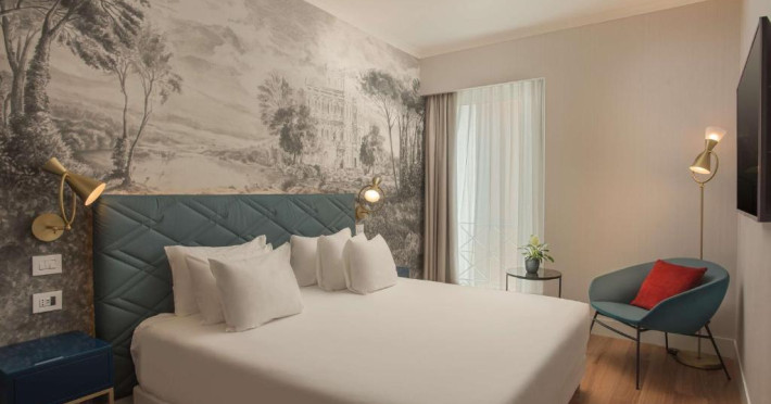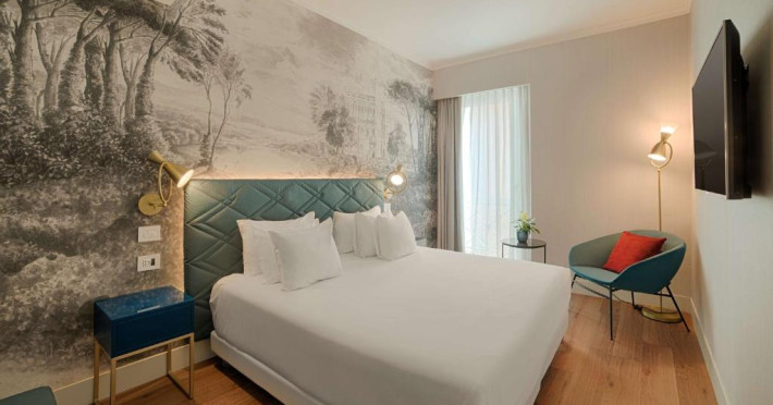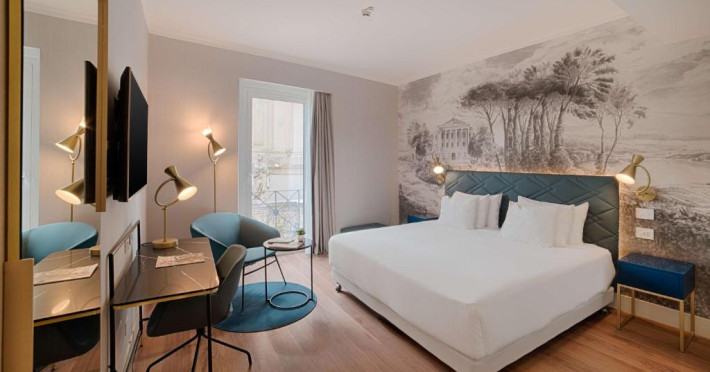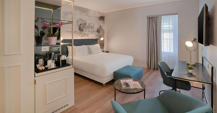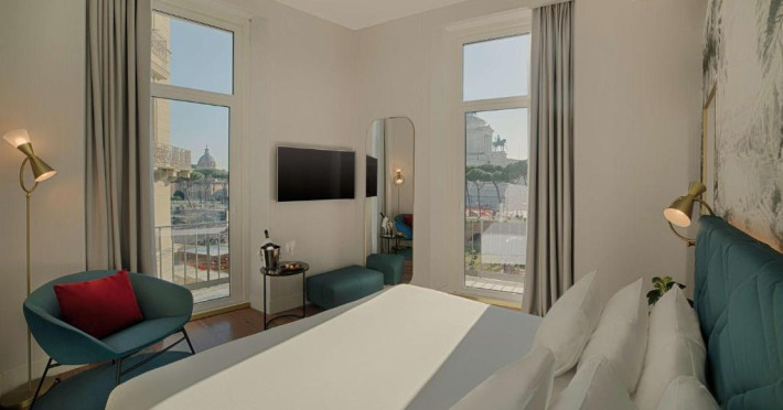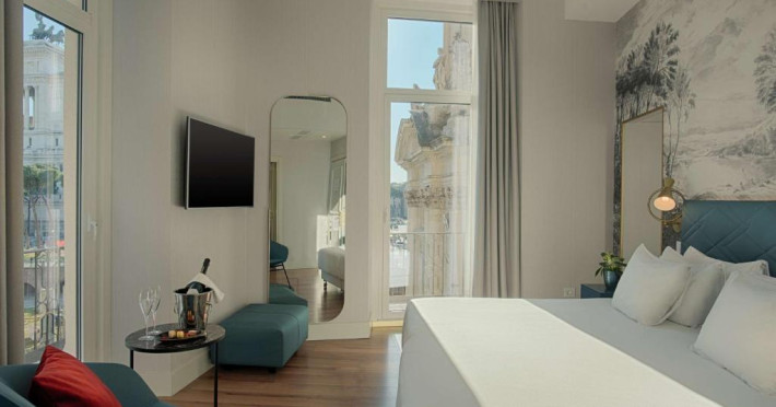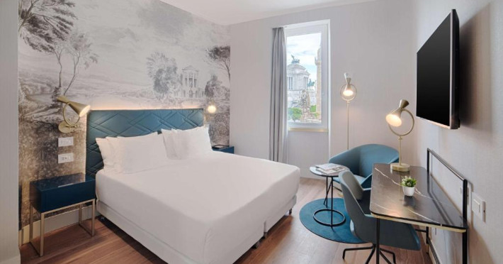 Camerele de la NH Collection Roma Fori Imperiali au design modern, in nuanțe aurii, turcoaz și gri, tapet cu vile din Roma, aer condiționat, TV cu ecran plat, minibar și baie privată. Cele mai multe camere oferă vedere la Forumul Roman.
